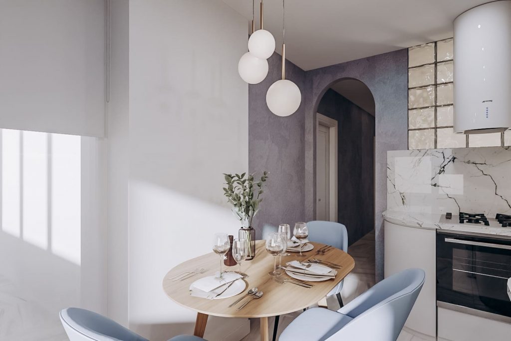 Овальный деревянный стол в окружении мягких синих стульев создает ощущение уюта и располагает к неспешным семейным ужинам. Низкие подвесные светильники с белыми матовыми шарами делают освещение мягким и приятным.
