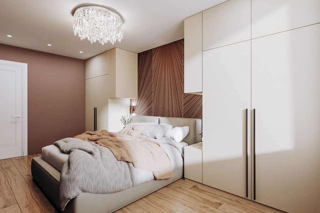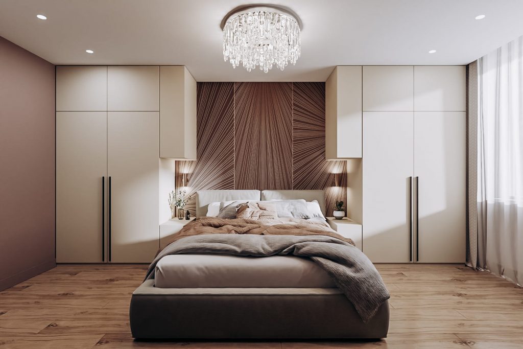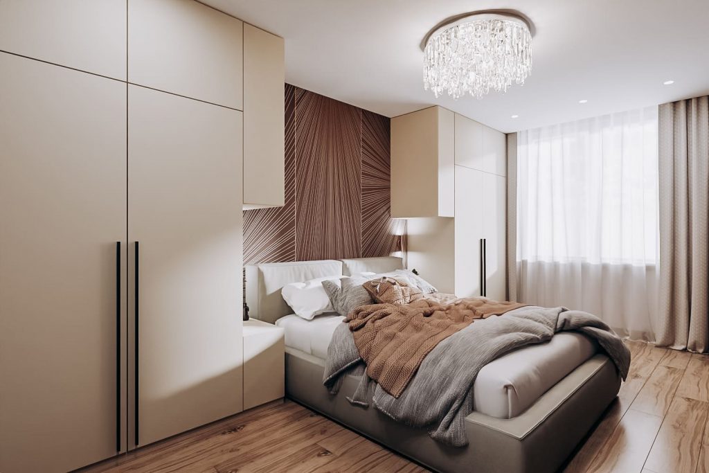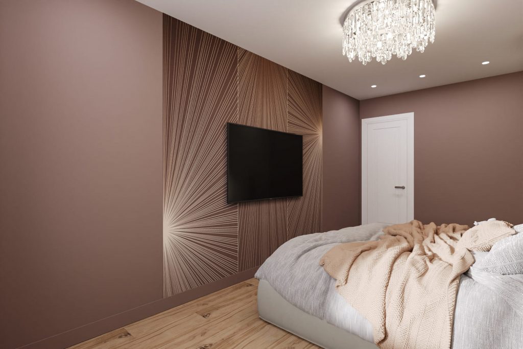 Сдержанного шика и одновременно уюта комнате придают: красивое контрастное сочетание обожаемых заказчиком оттенков - бежевого и кофейно-коричневого; обои-панно с рисунком-лучами в виде удачных акцентов в нише за кроватью и в зоне ТВ плазмы; и освещение - роскошная хрустальная классическая люстра и бра над полками-тумбами, дающие интересный рассеянный свет.