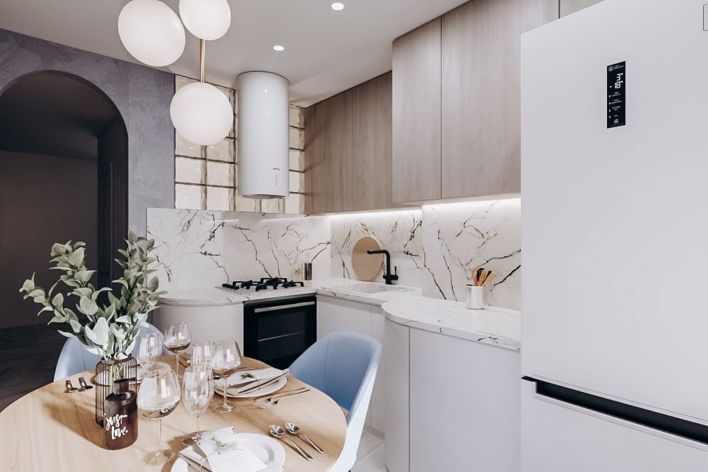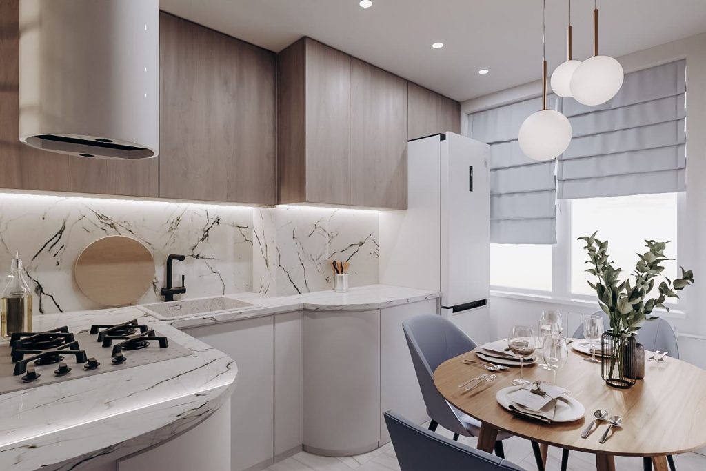 Кухня в этом дизайн-проекте – воплощение элегантного сочетания теплых и холодных оттенков, которые идеально дополняют друг друга. Светлая кухонная мебель с плавными закругленными формами визуально смягчает пространство, а текстура натурального дерева в верхних шкафах добавляет тепла. Мраморные поверхности с выразительными прожилками привносят ощущение роскоши и подчеркивают общий стиль интерьера.
