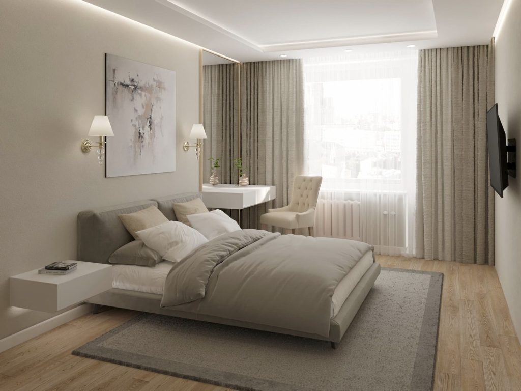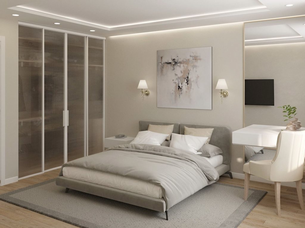 Центральный элемент спальни — кровать с мягким изголовьем в нейтральном серо-бежевом оттенке. Она дополнена парой подвесных прикроватных тумб, которые не загромождают пространство и поддерживают ощущение лёгкости. Оттенки в спальне выдержаны в единой тёплой гамме: бежевые, серые и кремовые тона создают ощущение уюта и спокойствия.