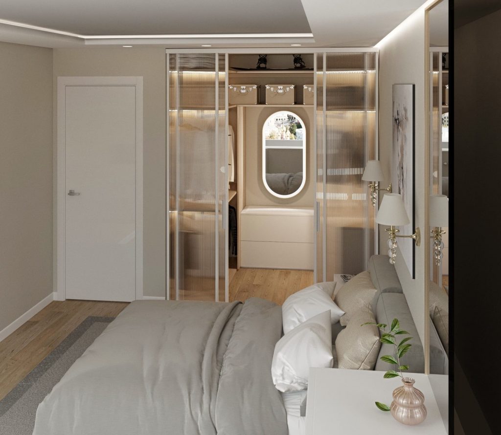 Отдельное внимание уделено встроенной гардеробной, которая отделена раздвижными рифлёными стеклянными дверями в лёгком белом профиле. Такое решение позволяет визуально разграничить пространство, но при этом сохранить ощущение открытости.