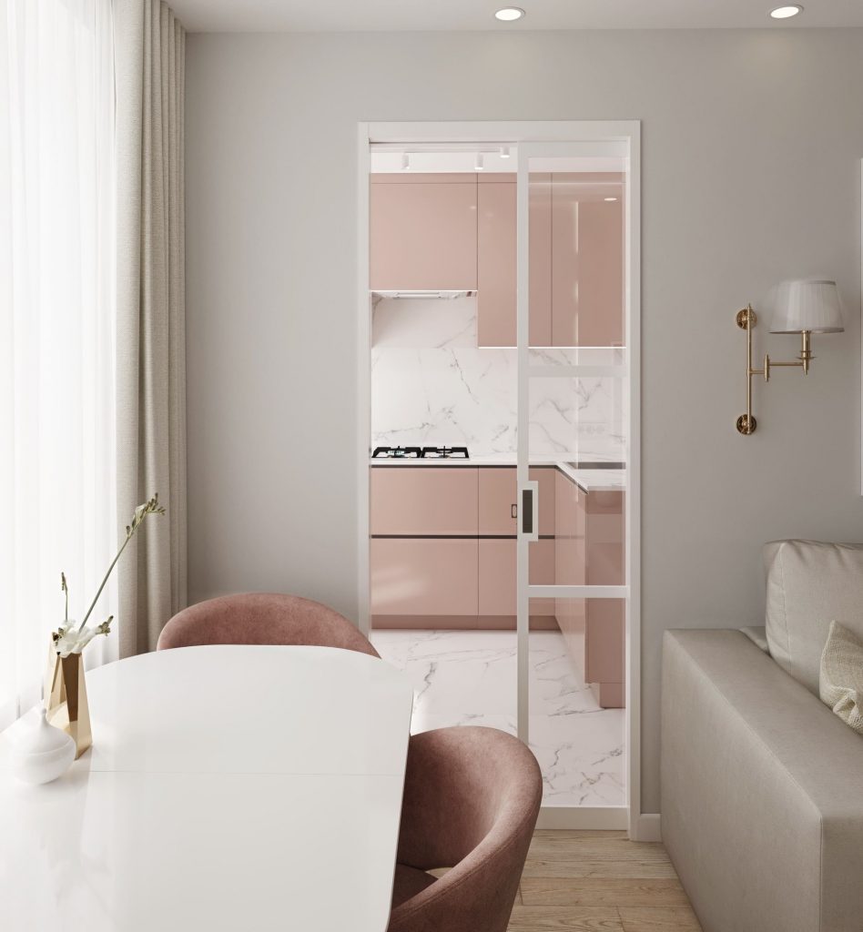 Основной акцент кухни — нежные фасады в пудрово-розовом оттенке с матовым покрытием. Они создают уютную и ненавязчивую атмосферу, при этом легко сочетаются с белым мраморным фартуком и столешницей. Крупноформатный керамогранит с мраморной текстурой на полу объединяет кухню с гостиной, создавая эффект цельного пространства.