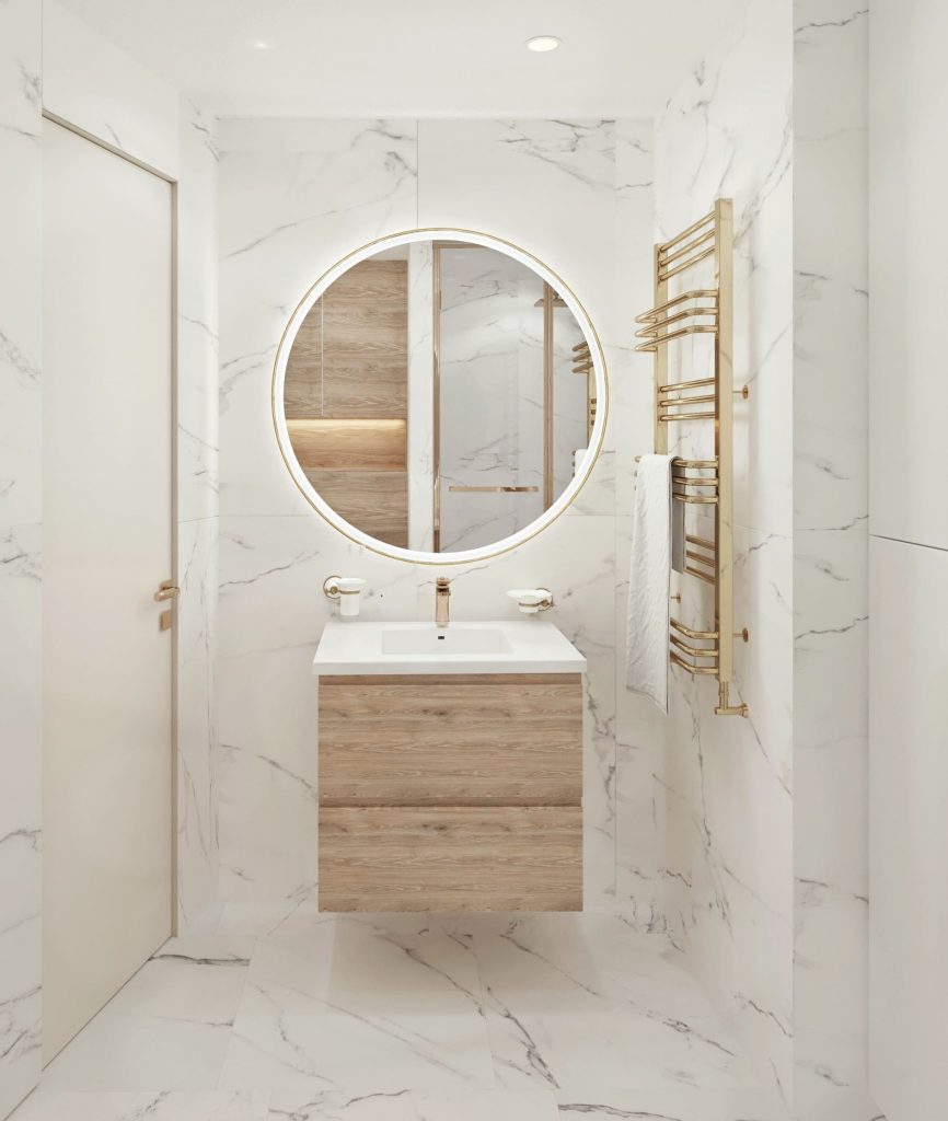 Светлый керамогранит с эффектом мрамора на полу визуально увеличивает площадь и делает пространство более воздушным. Светлые стены в сочетании с зеркальными поверхностями и встроенной подсветкой усиливают ощущение глубины.