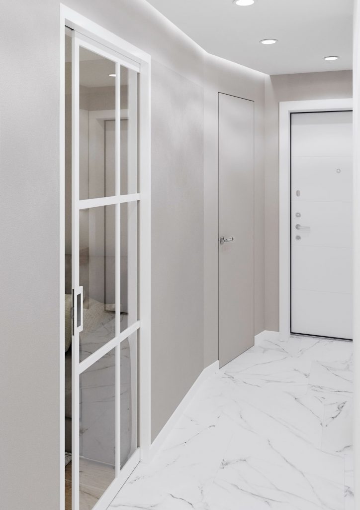 Одним из важных решений стало использование двух раздвижных дверей с кассетной системой: одна из них отделяет прихожую от гостиной, а вторая ведёт в приватную зону спальни. Белые стеклянные двери с тонким профилем визуально расширяют пространство, сохраняя при этом функциональное зонирование.