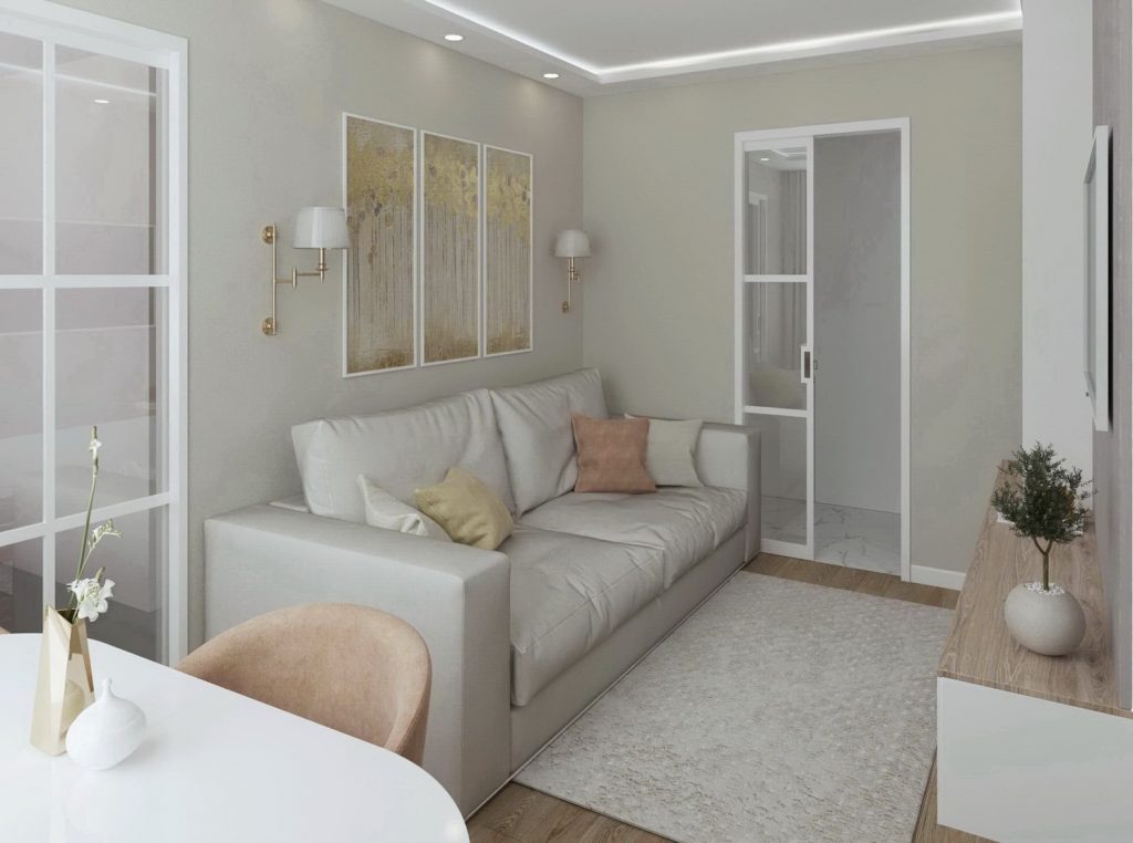Дизайн-проект однокомнатной квартиры в хрущевке для модой пары с современным интерьером преимущественно в светлых тонах с прихожей, коридором, гостиной, кухней, спальней и санузлом