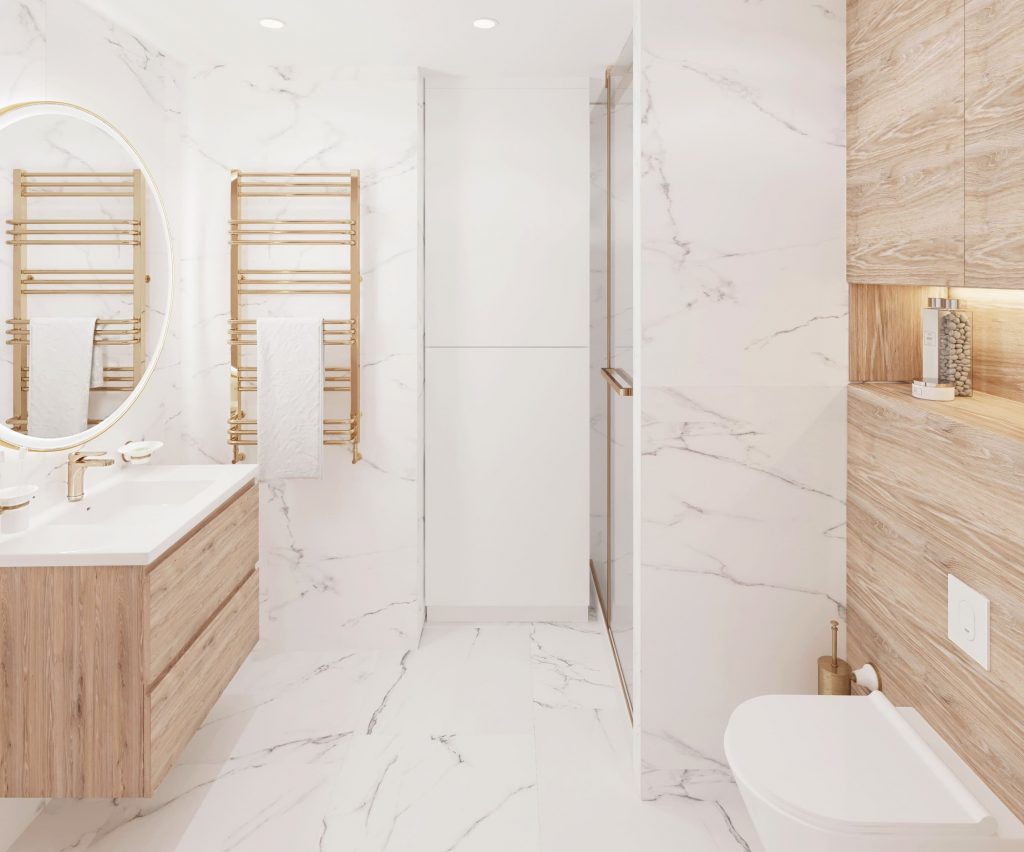 Основная палитра санузла выдержана в светлых тонах: керамогранит с мраморной текстурой создаёт эффект благородного натурального камня, а деревянные панели добавляют интерьеру тепла и уюта. Акценты выполнены в золотистых деталях — смесители, полотенцесушитель, фурнитура, что придаёт ванной комнате нотку изысканности.