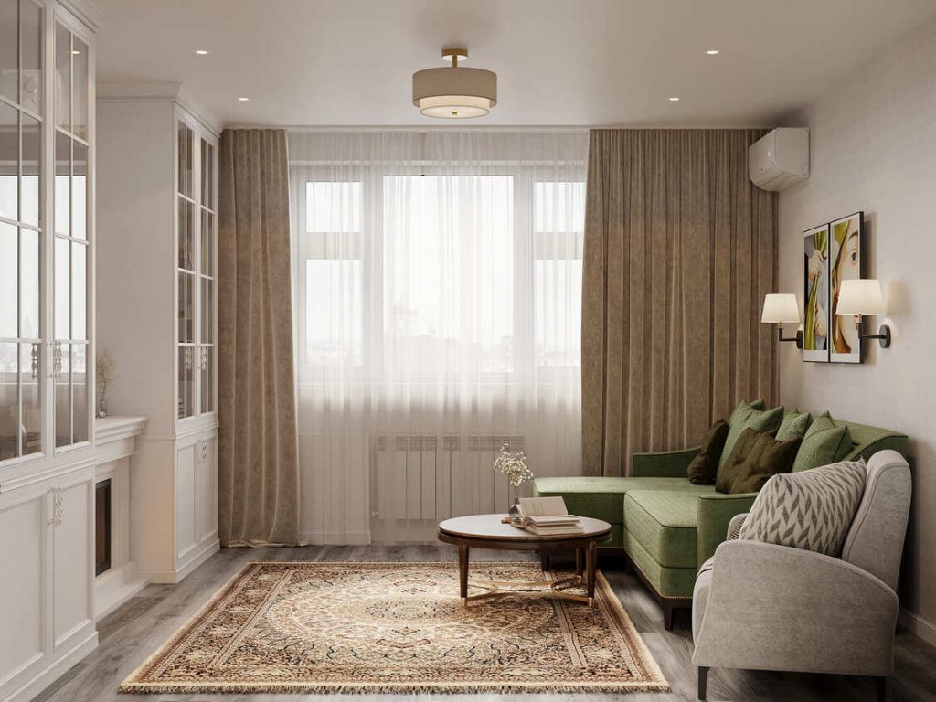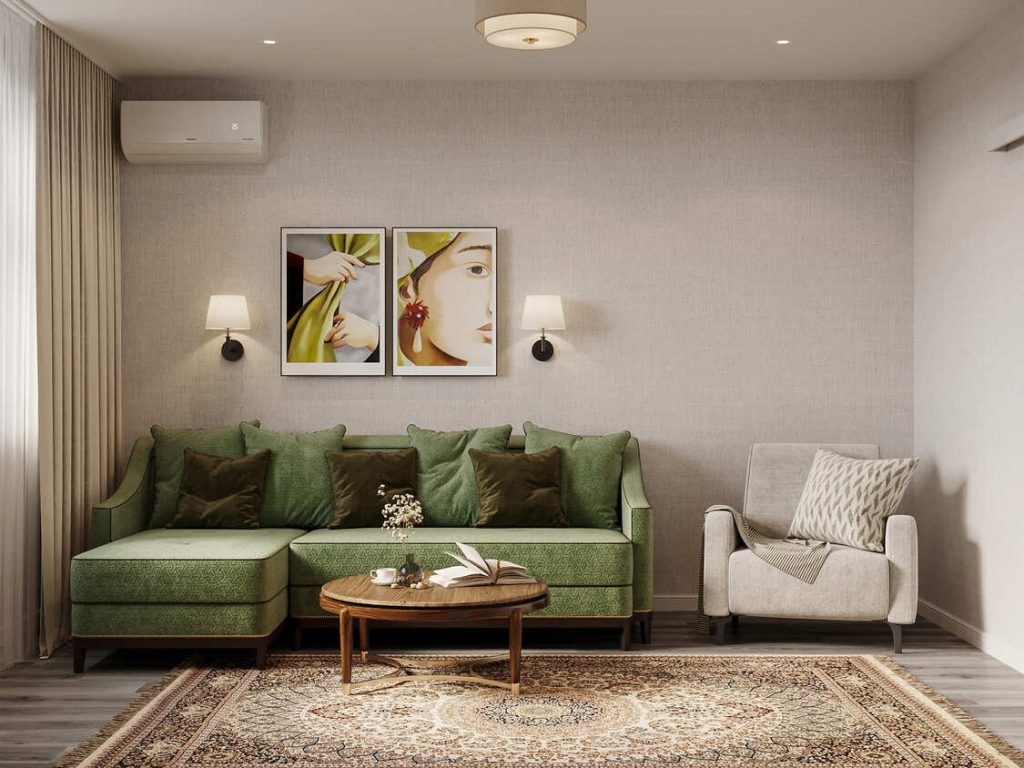 Гостиная в этом проекте — полноценное пространство для отдыха, общения и визуального удовольствия. В её основе — глубокий зелёный диван с бархатистой фактурой, который мгновенно притягивает взгляд и отсылает к винтажным мотивам. Он стал центральным цветовым акцентом комнаты, перекликаясь по тону с узором одного из главных героев интерьера — сохранённого восточного ковра.