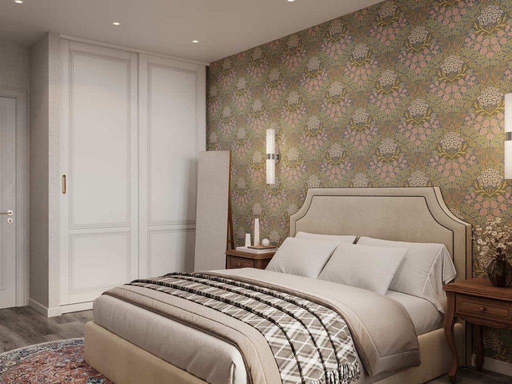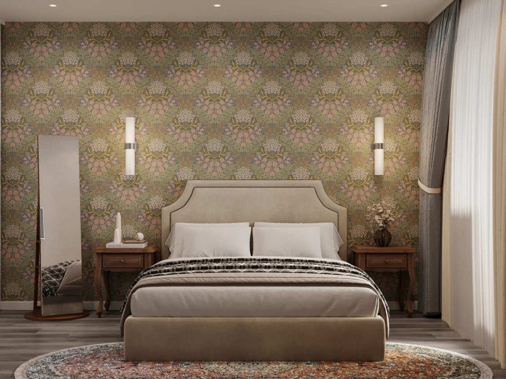 Центральным элементом стала выразительная акцентная стена с обоями в стиле модерн, напоминающими орнаменты Уильяма Морриса. Цветочный узор объединяет розовые, оливковые и золотистые оттенки, задавая тон всей комнате и одновременно подчеркивая один из ключевых ковров, сохранённых заказчиком.