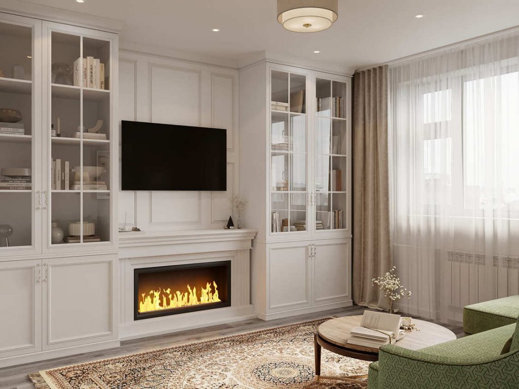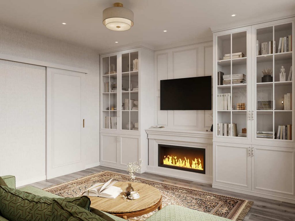 Тёплое пламя биокамина усиливает атмосферу уюта, а книги и детали на открытых полках создают ощущение обжитости и интеллигентного дома.