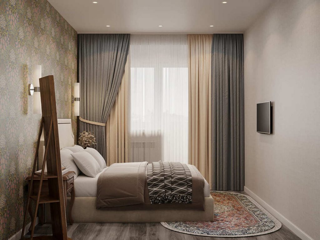 Мягкое изголовье кровати с декоративной отделкой добавляет классических нот, а текстиль — от плотных штор до пледа — задаёт ощущение уюта и защищённости. Светильники по бокам кровати создают мягкое, направленное освещение — идеальное для вечернего чтения. Приятный бонус — высокое зеркало на деревянной подставке, которое и функционально, и служит визуальной опорой в композиции.