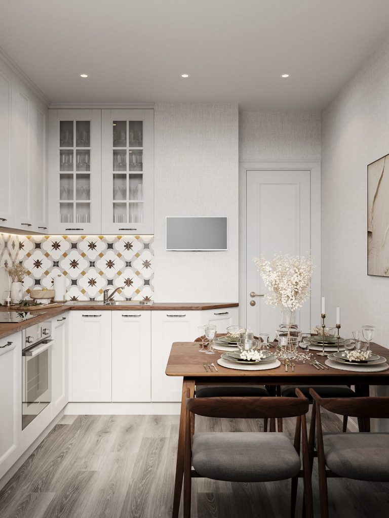 На кухне белые фасады со сдержанным молдингом отсылают к традиционным решениям, а столешница с тёплой древесной текстурой вносит уют и глубину.