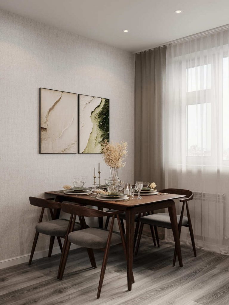 Обеденная зона — важная часть пространства. Стол из тёмного дерева и изящные стулья с мягкими сиденьями создают атмосферу спокойствия и камерности.