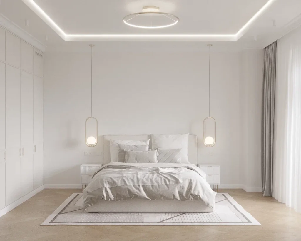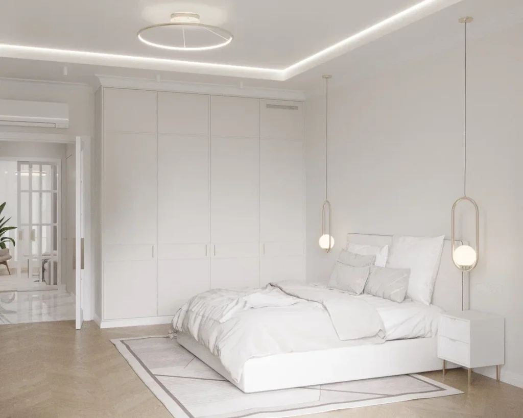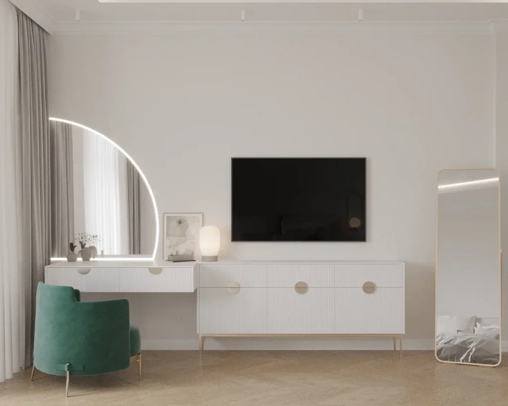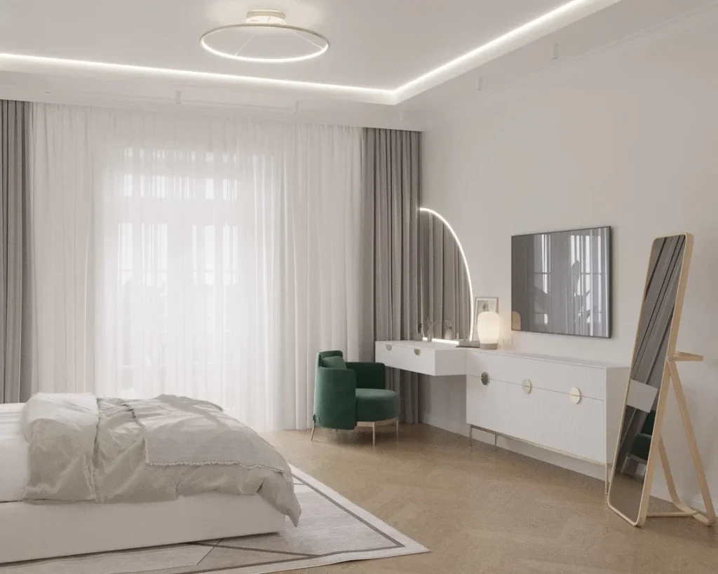 Белый цвет здесь главенствует, создается ощущение чистоты и воздушности во всем. Акцент только у зоны туалетного столика – изумрудное мягкое кресло. У туалетного стола зеркало в виде части круга с подсветкой. В комнате присутствуют и другие закругленные формы, сочетающиеся между собой: углы зеркала, ручки мебели, закругленное кресло, потолочный светильник. Комната просторная, не заставленная мебелью, в ней расположилось все необходимое. Огромный встроенный шкаф в белом цвете вмещает в себя все необходимое, но даже не заметен на первый взгляд. Конечно же, царица спальни, кровать – полностью в белом цвете, как и тумбы. Выделена по бокам высокими подвесными светильниками. Напротив кровати зона TV.