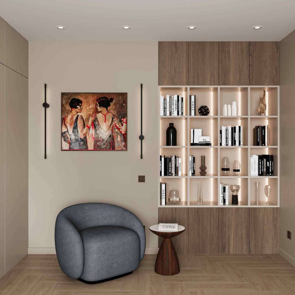 Отдельного внимания заслуживает библиотечный модуль с подсветкой: открытые полки с книгами и декоративными объектами делают комнату живой и индивидуальной. Рядом – картина из коллекции хозяев, которая органично встроилась в интерьер и добавила характер.