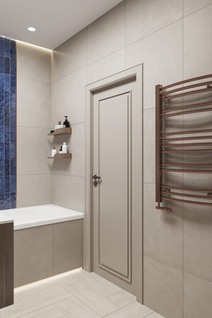 Светлая современная квартира в спокойной бежевой гамме с акцентами индиго, ржавчины и меди