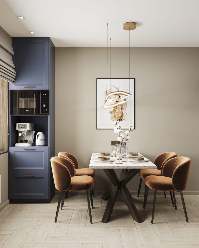 Обеденная зона решена особенно выразительно: массивный стол на металлических ножках с каменной столешницей окружен мягкими стульями в оттенке ржавчины. Здесь цветовое сочетание индиго и теплой меди проявляется особенно гармонично. Нестандартный подвесной светильник с плавной формой подчеркивает современный характер интерьера и добавляет динамики.