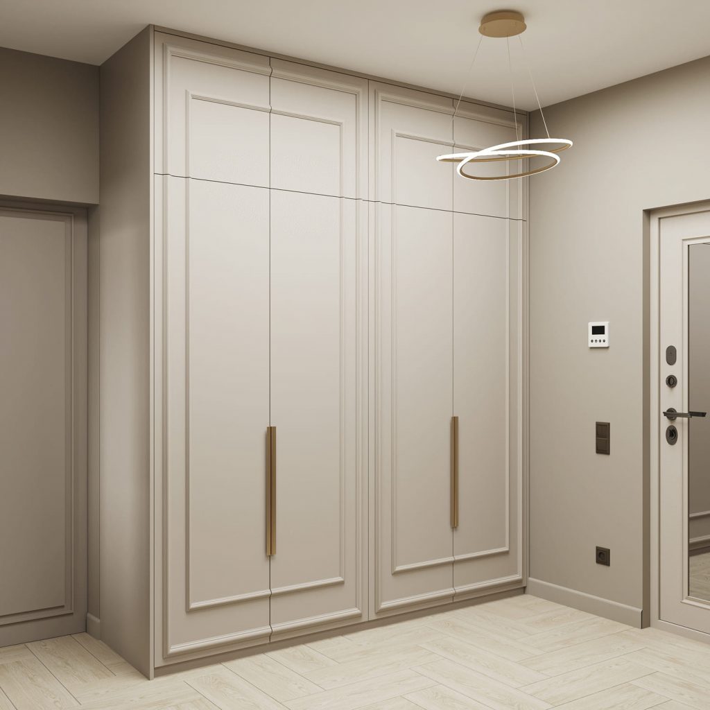 Прихожая выполнена в мягкой бежево-серой гамме, где каждый элемент продуман для удобства. Высокие встроенные шкафы с филёнчатыми фасадами обеспечивают достаточное пространство для хранения.