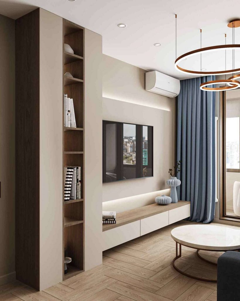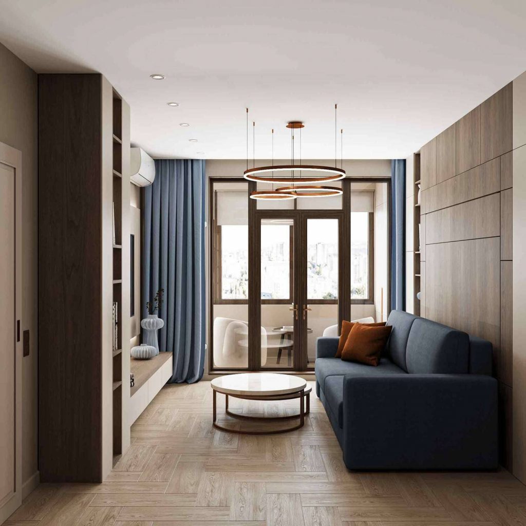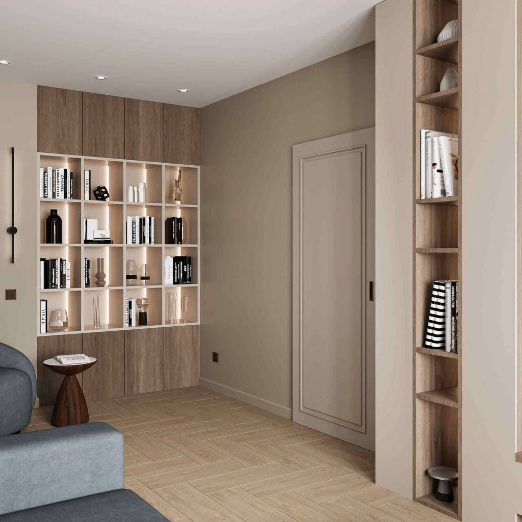 Нейтральные бежевые панели на стенах выступают фоном, а встроенные ниши для книг и мелочей добавляют удобства. Яркие акценты в виде подушек глубокого синего цвета поддерживают общую цветовую концепцию квартиры и придают интерьеру живость.