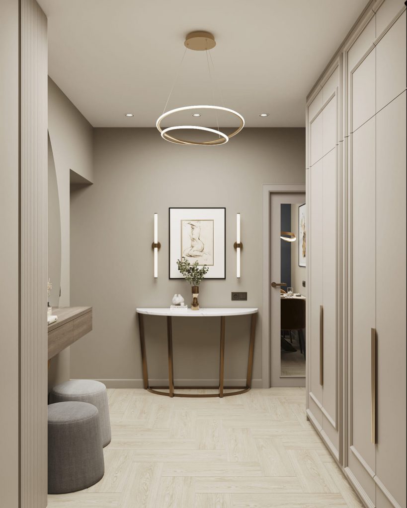 С другой стороны прихожей расположилась изящная консоль на тонких медных ножках с белой столешницей. Над ней — графичный рисунок и пара вертикальных бра, добавляющих элегантности. В результате пространство выглядит не просто как функциональная зона, а как полноценная интерьерная сцена, задающая тон всей квартире.