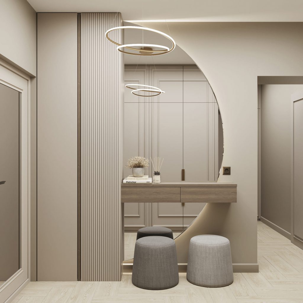 Главный акцент — зона консоли с большим круглым зеркалом, подсветкой и подвесными светильниками в форме лаконичных колец. Дополняют композицию мягкие пуфы в нейтральных оттенках.