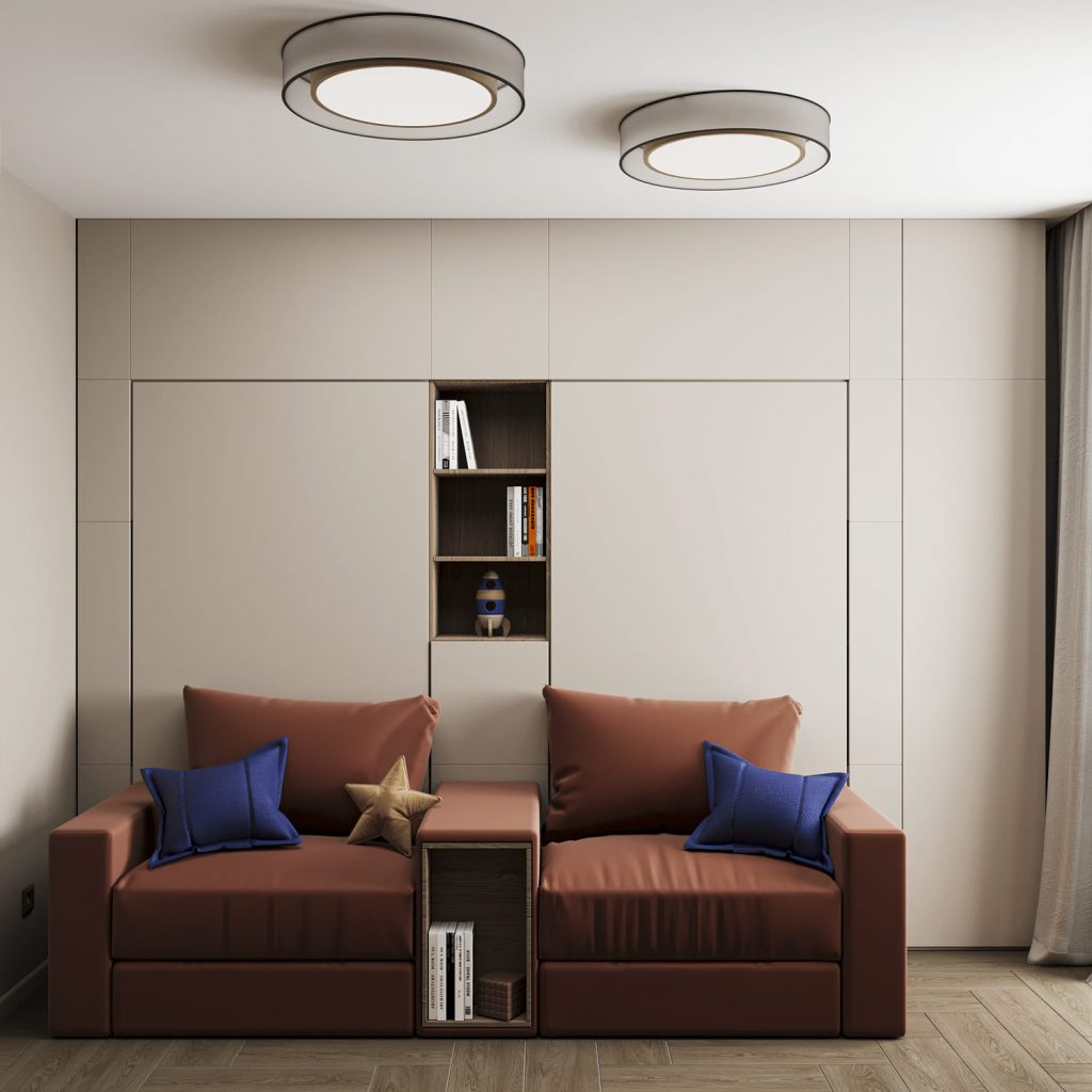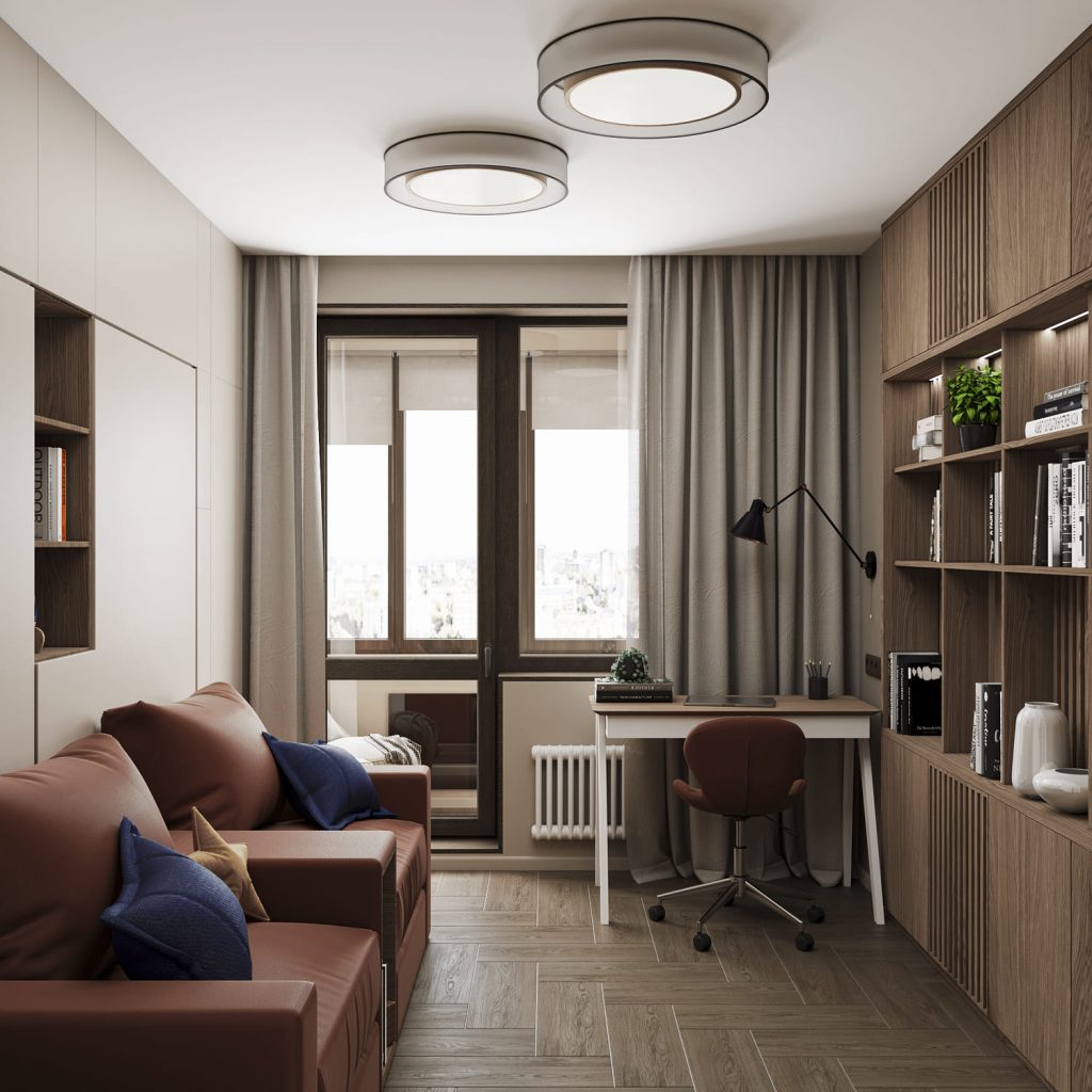 Центральный элемент — система трансформеров: днём это два компактных дивана в насыщенном оттенке ржавчины, а вечером они превращаются в полноценные отдельные кровати. Решение идеально подходит для экономии места и делает комнату гибкой к разным сценариям.