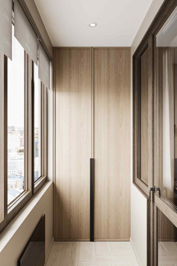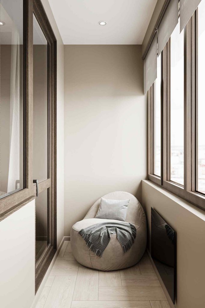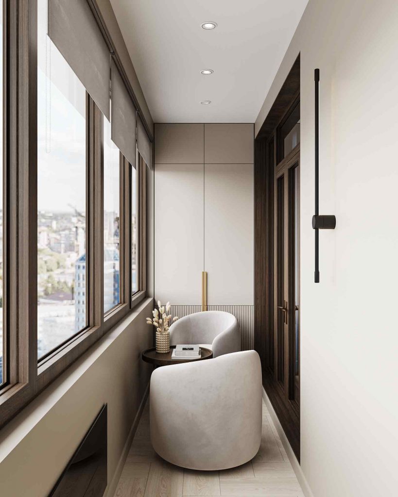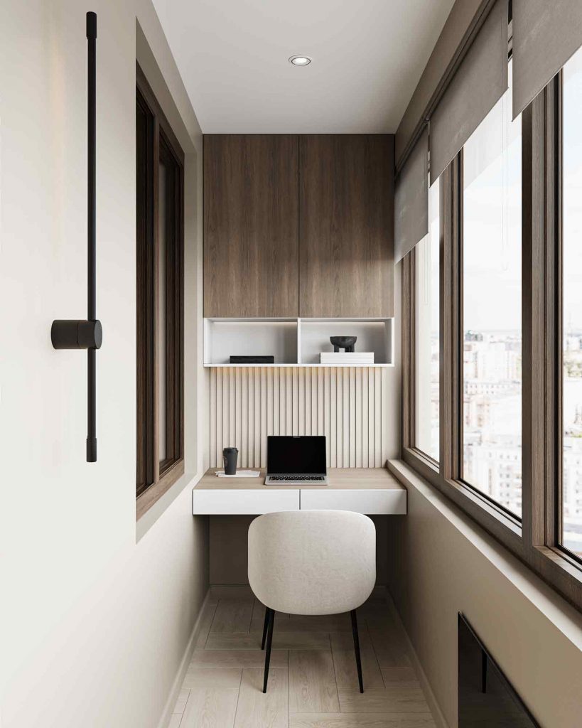 Лоджия расширяет функционал квартиры: здесь обустроен домашний офис с компактным столом и полками, а также зона отдыха с креслами и столиком у окна. Большие окна делают пространство светлым и воздушным, а спокойная цветовая гамма поддерживает общий ритм интерьера. Это место одинаково подходит и для работы, и для утреннего кофе.