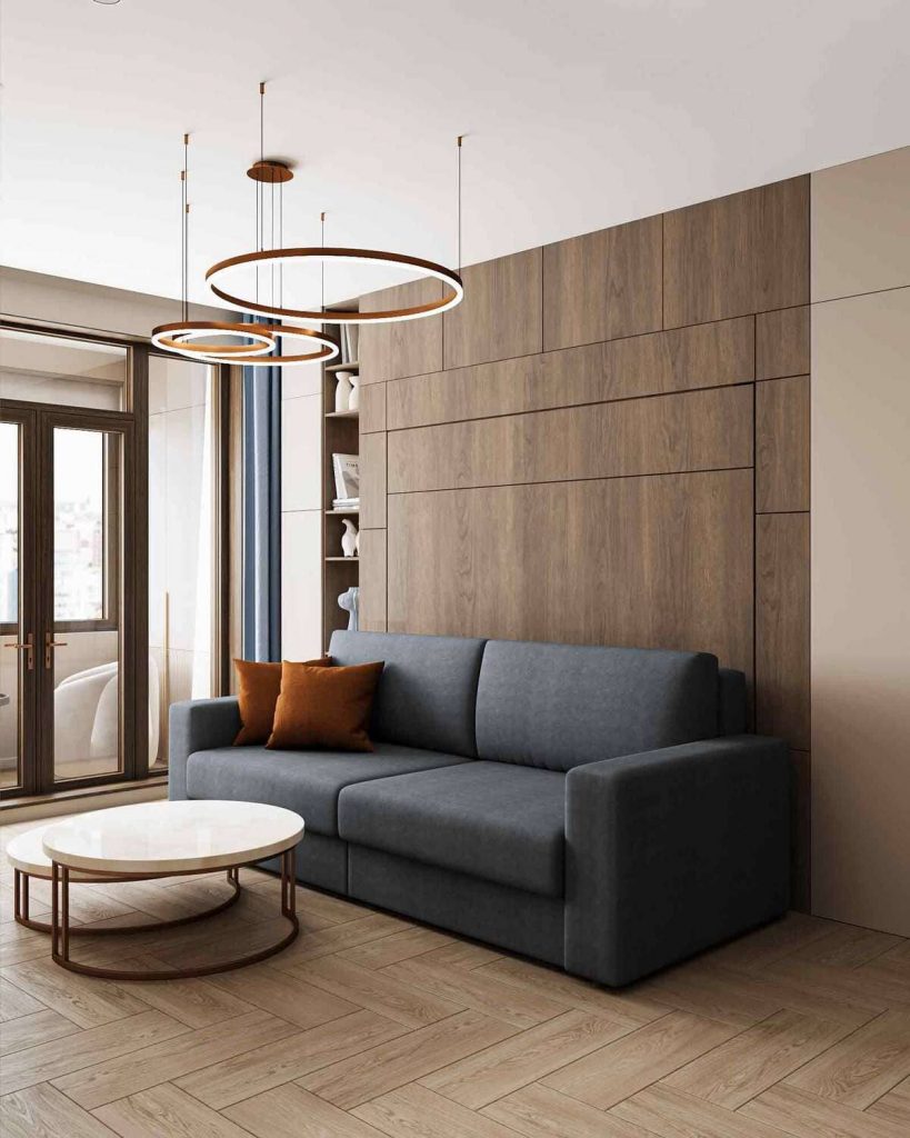 Гостиная стала воплощением идеи «дневная зона – трансформер». Здесь уютный диван в насыщенном синем оттенке днём служит местом для отдыха и встреч, а вечером из стены опускается полноценная двуспальная кровать. Стена за диваном отделана панелями под дерево с аккуратной раскладкой.