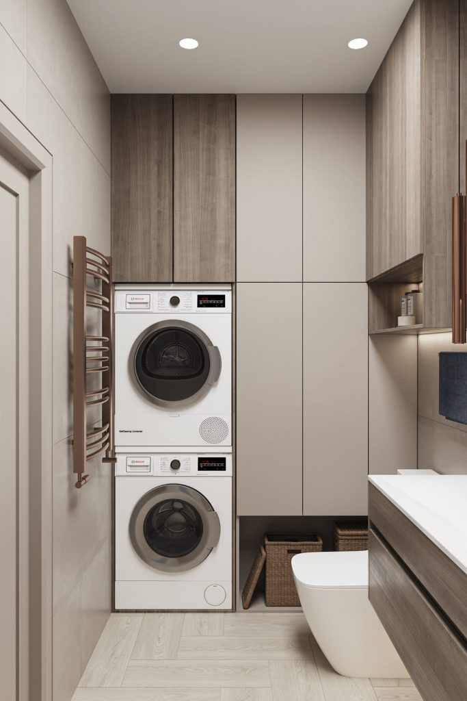 Вся мебель и сантехника подобраны с акцентом на практичность: встроенные шкафы скрывают бытовые мелочи, а колонна для стиральной и сушильной машин расположена максимально компактно под несущей балкой. Дополнительное место для хранения организовано в закрытых модулях и в корзинах под шкафом.