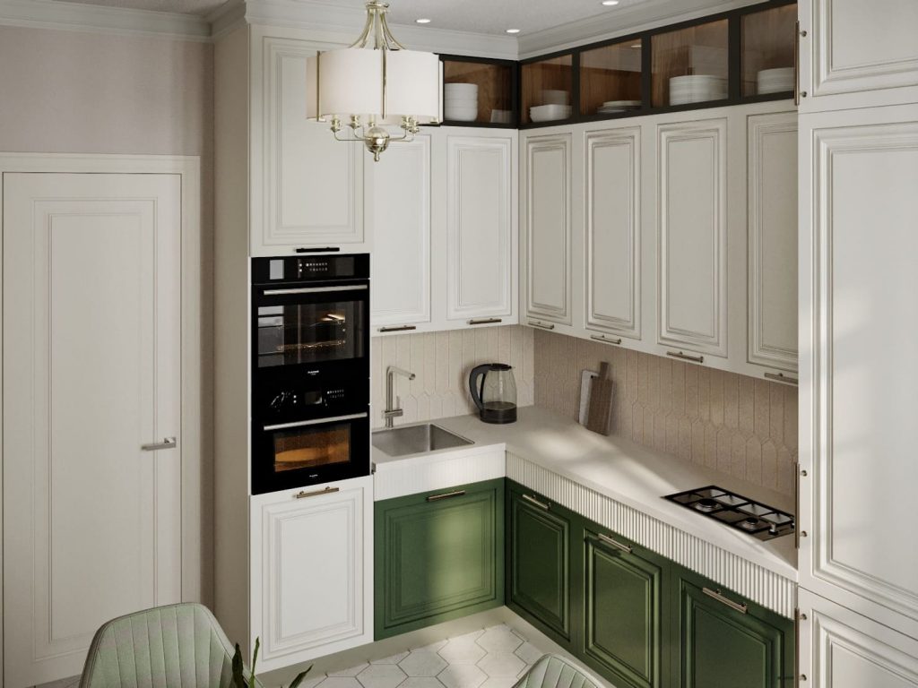 Кухня включает две зона - собственно, кухни и обеденную. Первая - это угловой кухонный гарнитур в классическом стиле, оснащенный всем необходимым - встроенными духовым шкафом с СВЧ, раковиной, плитой, холодильником, нижними модулями со столешницей для разделки продуктов, верхними шкафами и дополнительным рядом секций со стеклянными прозрачными дверками (для праздничной посуды).