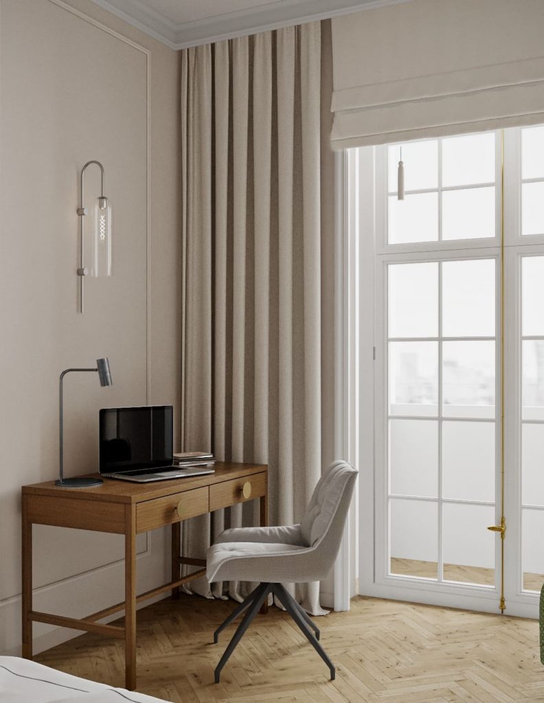 Спальня оформлена тоже стильно и функционально. Она включает основные три зоны: отдыха, рабочую и хранения. Первая – это большая кровать с мягким комфортным изголовьем и вместительными прикроватными тумбочками с выдвижными ящиками. Рабочая зона содержит компьютерный стол-консоль с выдвижными ящиками и комфортное компьютерное кресло. Система хранения представлена большим гардеробным шкафом до потолка. Также, в комнате имеется небольшая зона для чтения в виде удобного кресла, кофейного столика и подвесной полки.