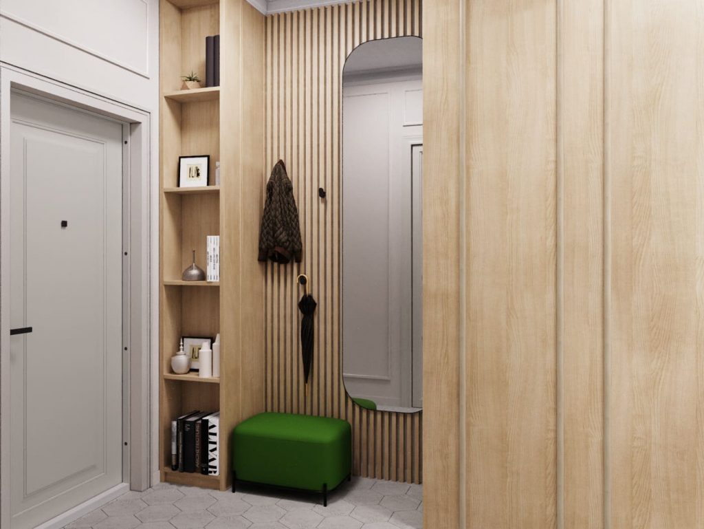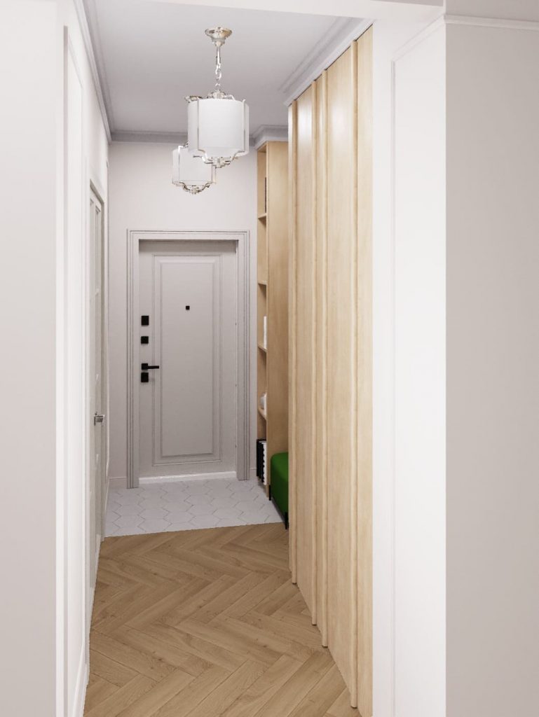 Дизайн-проект этой двухкомнатной квартиры составлялся для семьи. Заказчики хотели получить одновременно стильный, современный и функциональный интерьер, потому была выбрана неоклассика. Этому направлению соответствует и прихожая - она оформлена лаконично - в ней только главное: открытый модуль с полками до потолка, на которых можно разместить не только ключи, зонт или перчатки, но и книги, декоры, фото, благодаря чему привносится уют в помещение. Также, здесь - удобная банкета, чтобы с комфортом обуться или разуться; крючки для одежды или зонтов на стеновой панели из деревянных реек; большое зеркало, чтобы можно было посмотреться во весь рост, прежде чем выйти на улицу; и большой гардеробный шкаф. Шик придают прихожей классические люстры.