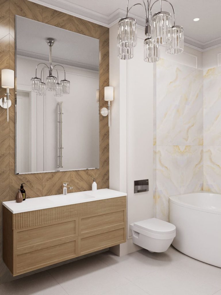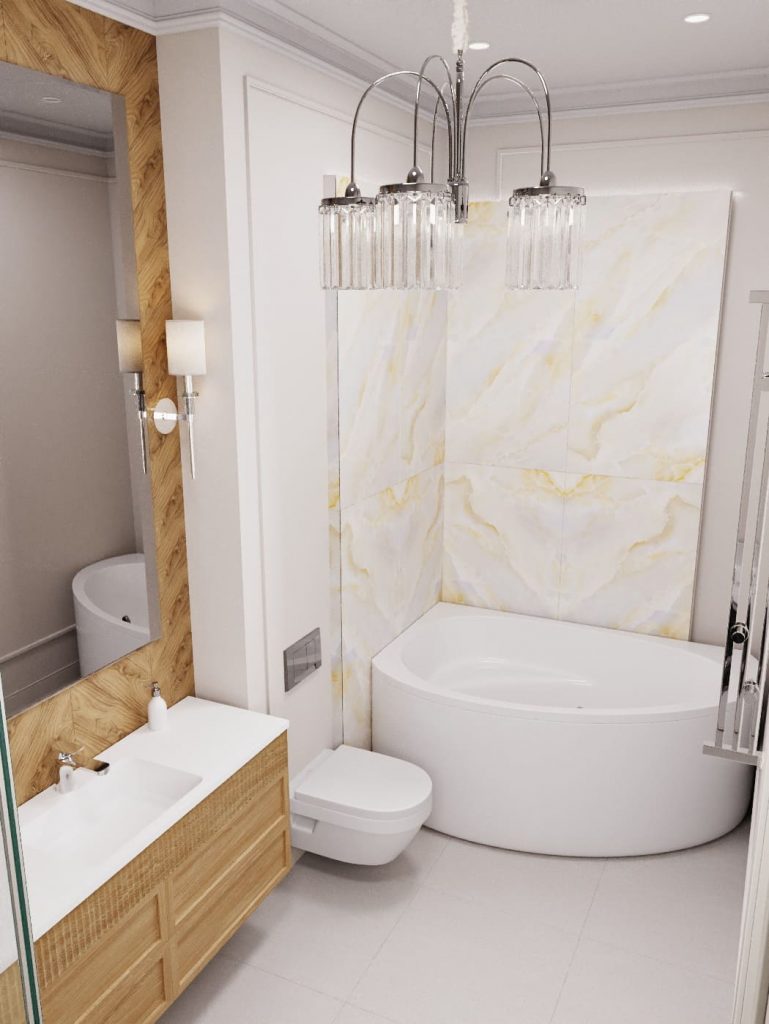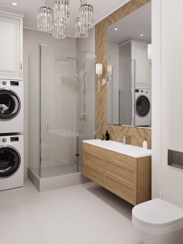 Санузел включает по пожеланию заказчиков и угловую ванну, и душевую. Кроме этого - подвесной унитаз; мойку с большой подвесной тумбой с выдвижными секциями, над которой размещено большое зеркало, визуально расширяющее пространство; встроенные стиральную и сушильную машины и шкафчик для хранения над ними. Основное освещение ванной - это точечные светильники и красивая классическая люстра, дополнительное - бра с абажурами, обрамляющие зеркало.