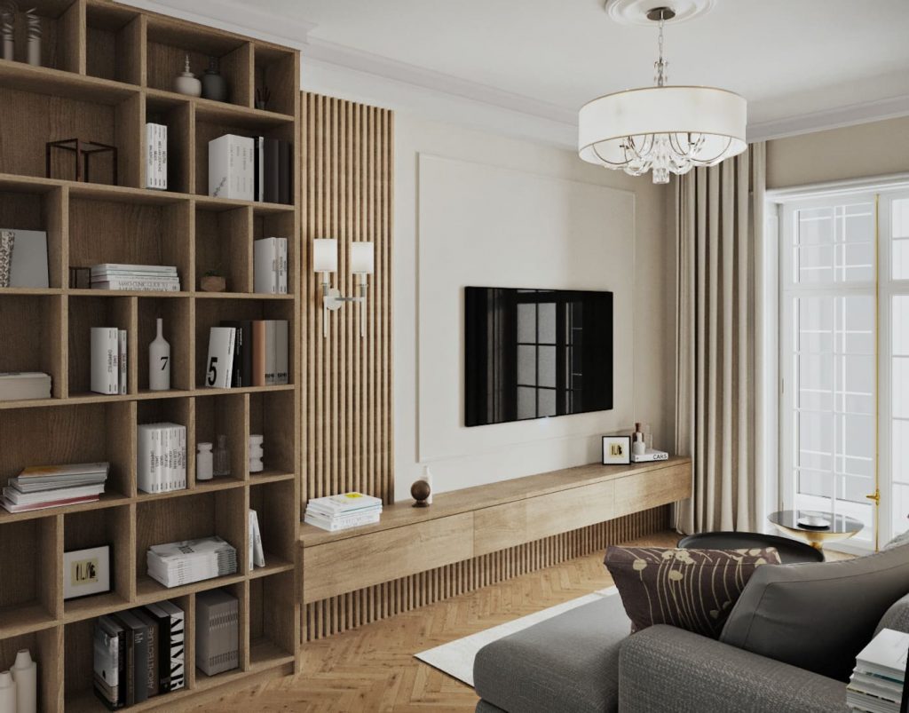 Гостиная разделена на две функциональные зоны - отдыха и хранения. Первая включает вместительный угловой диван со сдвоенным столиком, ТВ панель с подвесной длинной ТВ тумбой. Зона хранения - это большой стеллаж-книжница с множеством полок, добавленный по просьбе заказчиков, и компактная подставка для книг рядом с диваном.