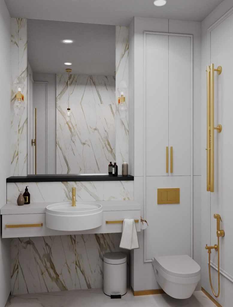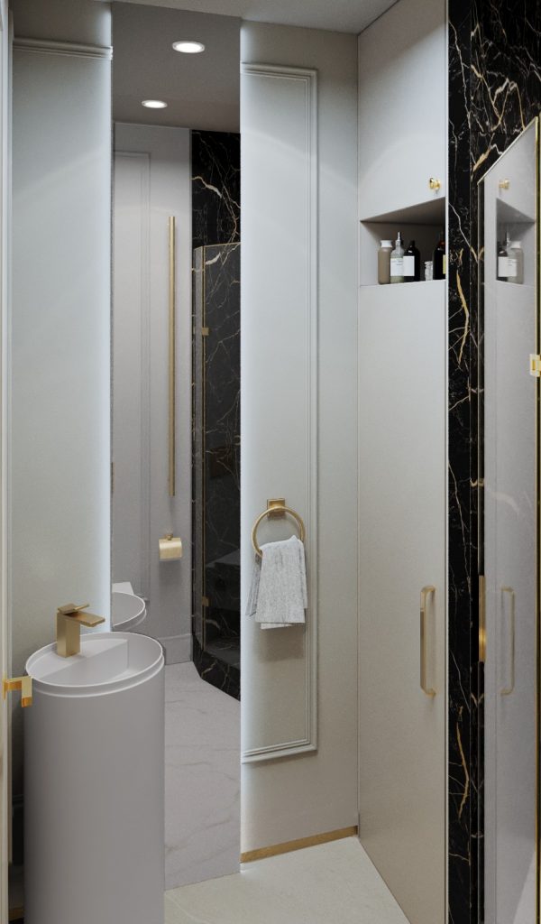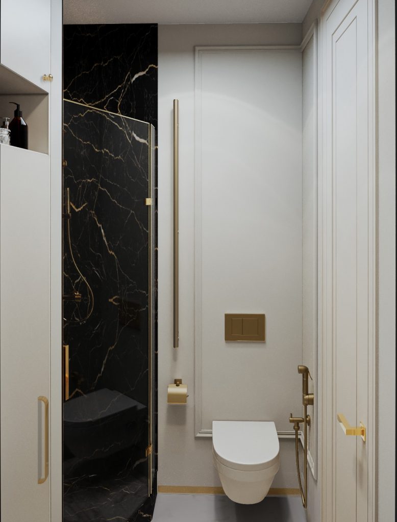 Контраст черного мрамора с золотыми прожилками и светлых матовых поверхностей в туалете создает эффект глубины и роскоши, а латунные акценты придают интерьеру благородство и теплоту.