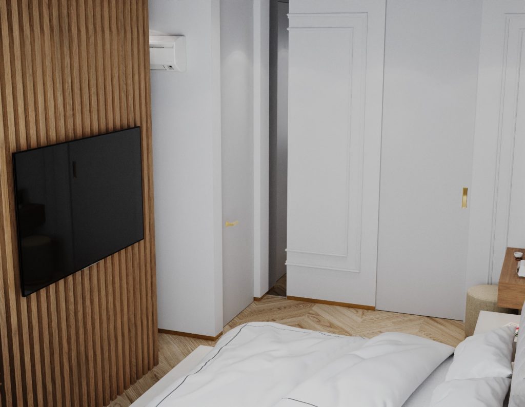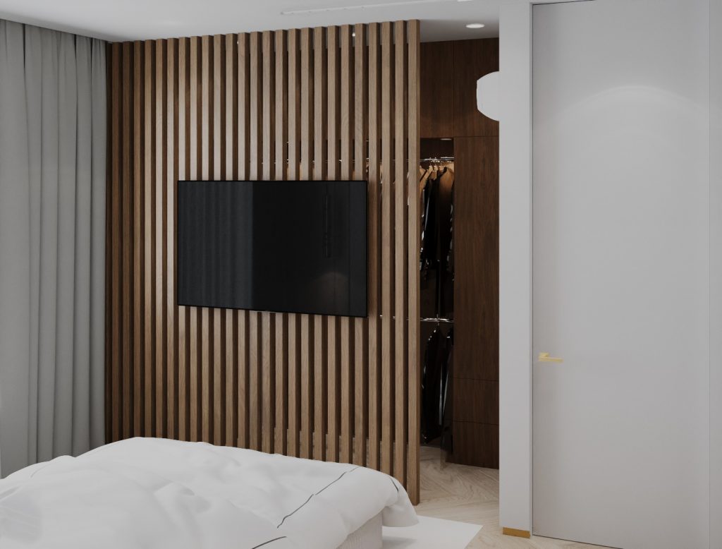 Интересным акцентом стала декоративная деревянная перегородка с рейками, за которой скрывается гардеробная зона. Такой прием не только добавляет интерьеру ритмичности, но и делает пространство более динамичным. Телевизор органично вписан в эту перегородку, что избавляет от необходимости устанавливать дополнительные конструкции.