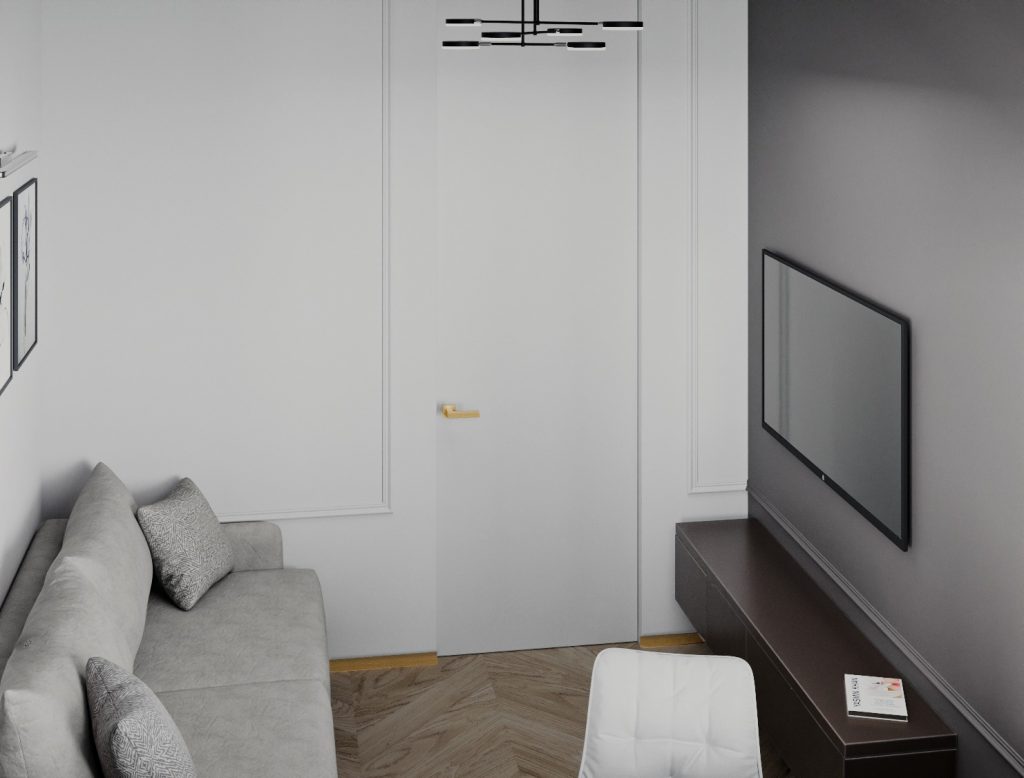 Дизайн-проект двухкомнатной квартиры в брежневке для семьи из двух человек со светлым интерьером, контрастными акцентами, молдингами, латунными вставками и натуральным деревом с прихожей, коридором, кухней-гостиной, спальней, гостевой комнатой, ванной комнатой и туалетом
