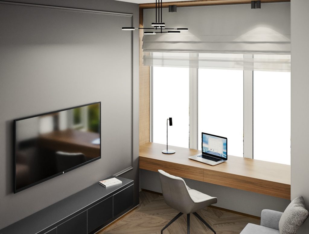 Одним из ключевых решений этой комнате стало расположение рабочего места у окна. Длинная деревянная столешница, встроенная в нишу, обеспечивает достаточно пространства для комфортной работы. Большие окна наполняют комнату естественным светом, а римские шторы позволяют регулировать освещение.