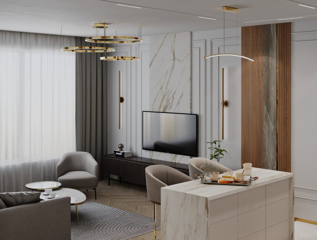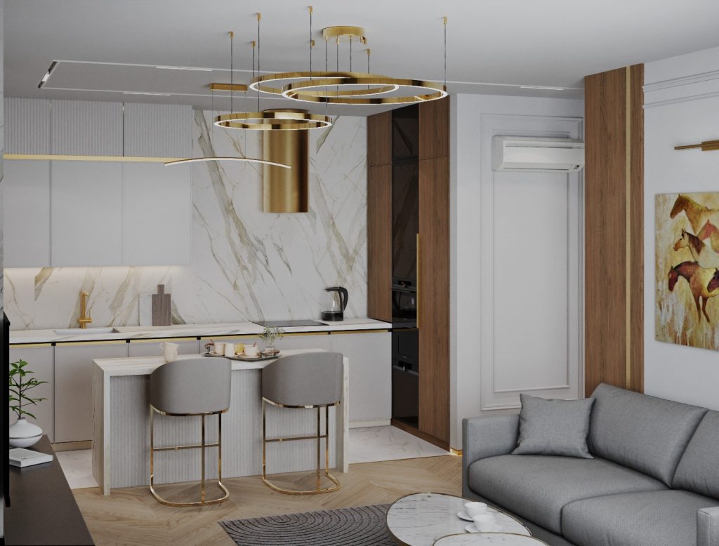 Отдельное внимание привлекает современная люстра из золотистых колец, парящая над гостиной зоной.
