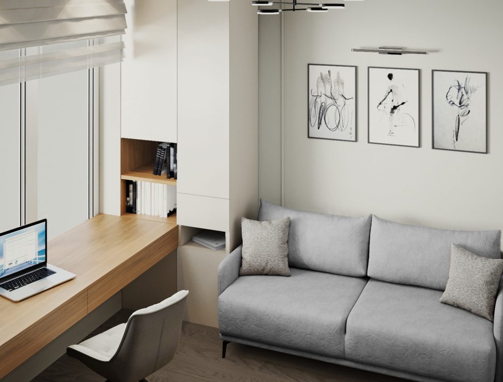 Вторая часть комнаты отведена под зону отдыха. Уютный диван в светло-сером оттенке служит как местом для комфортного отдыха, так и дополнительным спальным местом для гостей. Над диваном расположены три элегантных графичных постера в черных рамках, поддерживающие общий стиль интерьера.