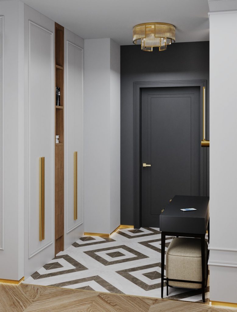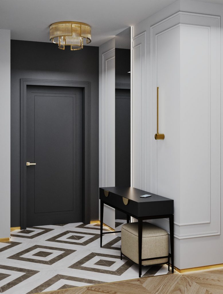 Прихожая оформлена в контрастной палитре: темные двери и графитовые стены создают выразительный фон, а белые молдинги и латунные вставки добавляют интерьеру изысканности. Центральный элемент — эффектная люстра с золотистыми элементами, задающая тон всему пространству.