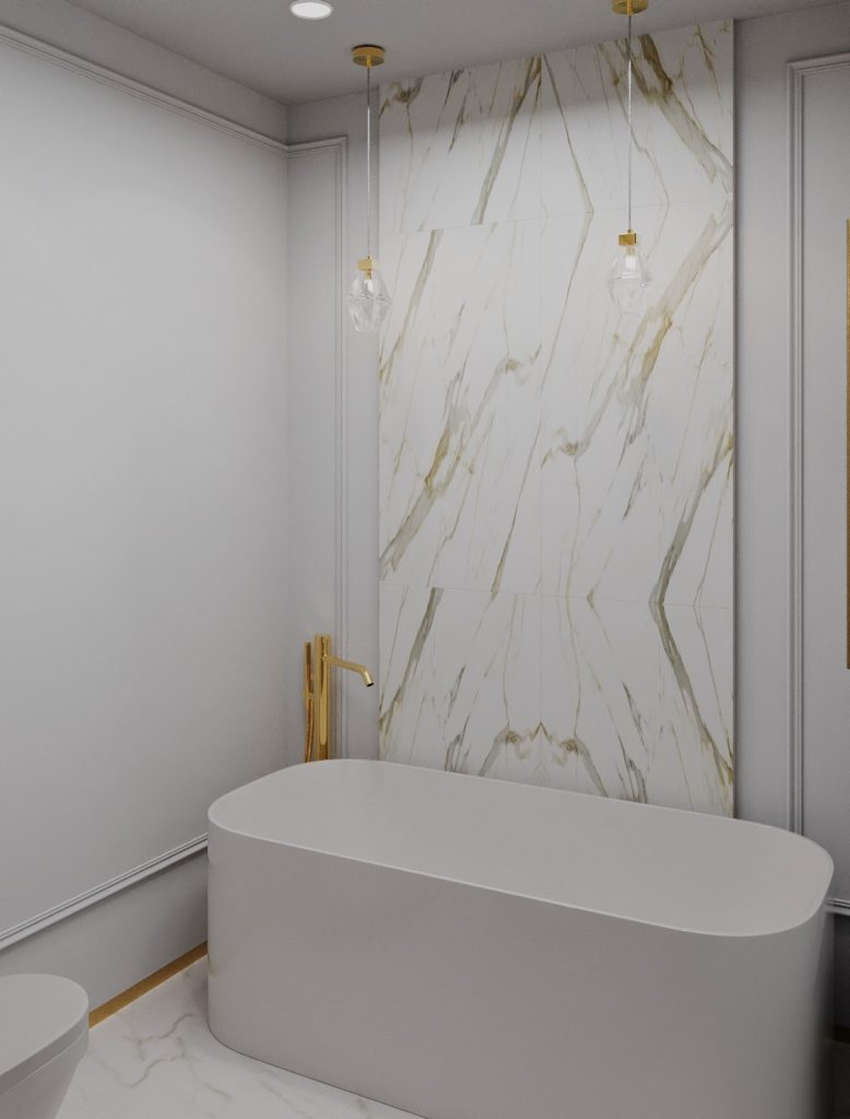 Центральное место в интерьере занимает отдельно стоящая ванна с мягкими обтекаемыми формами. Её матовая поверхность гармонично сочетается с фактурой мрамора на стене, создавая спокойную, но выразительную композицию. Настенные подвесные светильники с прозрачными плафонами добавляют легкости и создают мягкое зонированное освещение.