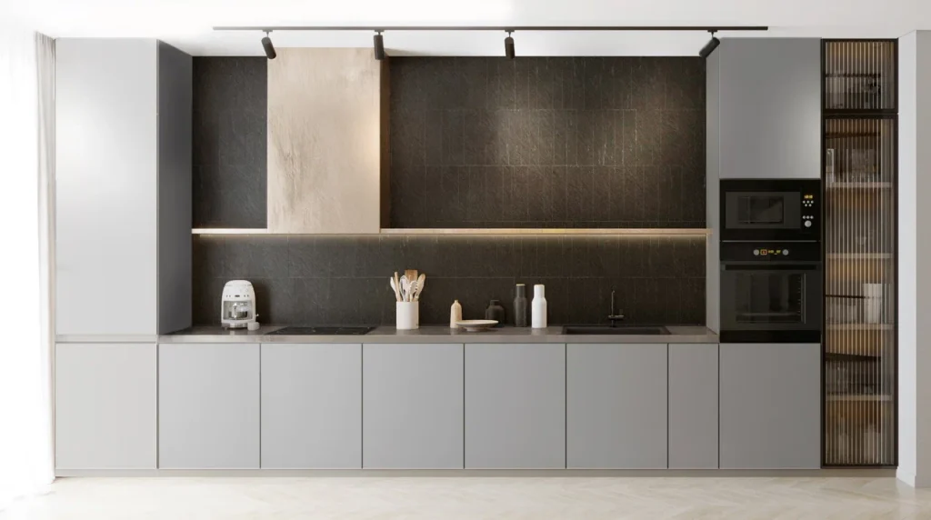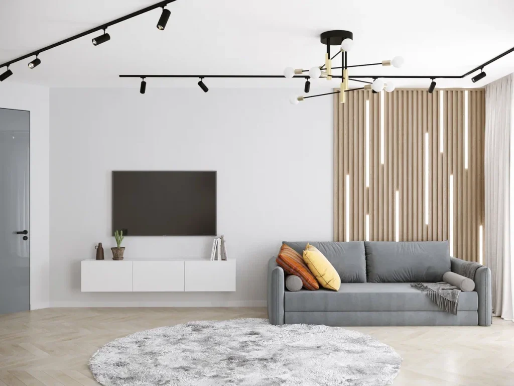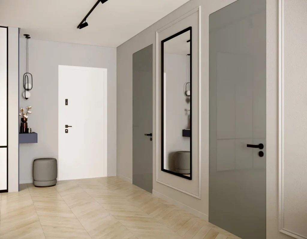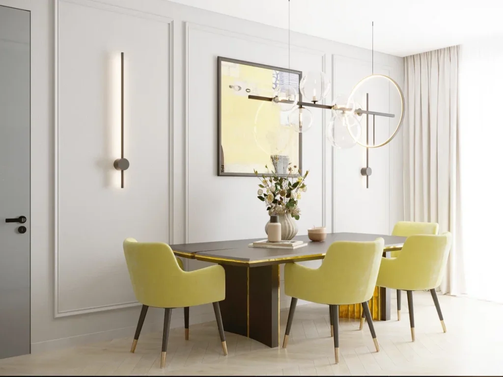 Просторный и светлый интерьер разработан для семьи из трёх человек. Он был создан с минимальными затратами для преображения старого ремонта. Интерьер состоит из серых и бежевых оттенков с яркими свежими акцентами в мебели, лепнине на стенах, качественных отделочных материалов, а пол уложен французской елочкой. Высокие двери скрытого монтажа с глянцевой отделкой. Это современный стиль с элементами классики. Неотъемлемая часть любого современного интерьера – продуманные разные сценарии освещения в квартире. Главный объект — это кухня, так как ее видно сразу, попадая в квартиру. Интересным декоративным приемом украшена кухонная зона: верхние шкафы отсутствуют, вместо них короб, отделанный декоративной штукатуркой под металл, и единая полка с подсветкой рабочей поверхности. Роскошный деревянный обеденный стол с латунными вставками расположен вдоль стены и имеет локальную подсветку в виде подвесного светильника. Мягкие обеденные стулья акцентного лимонного цвета.