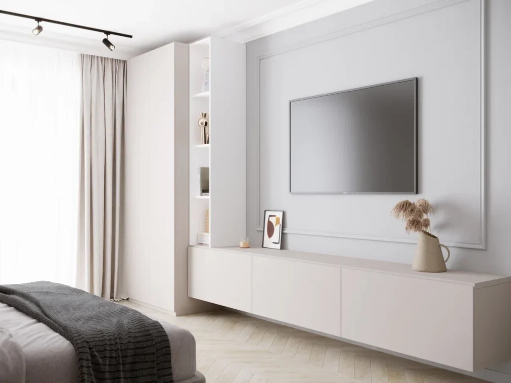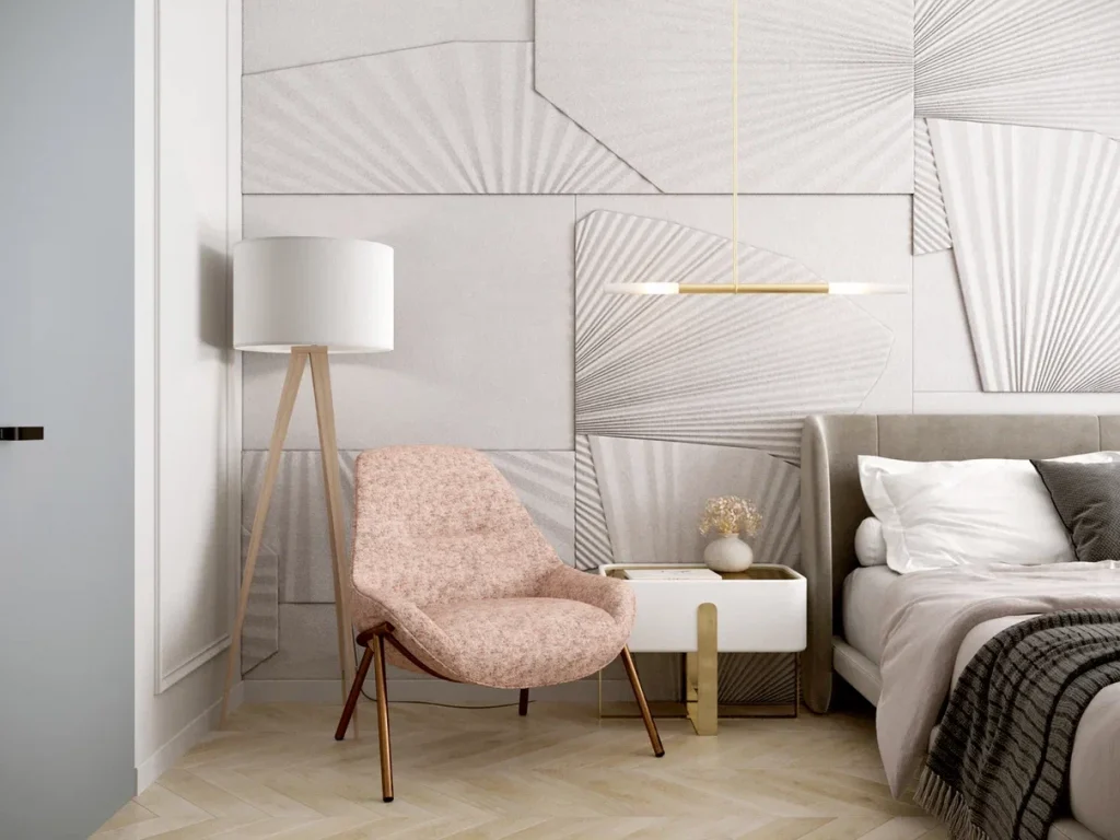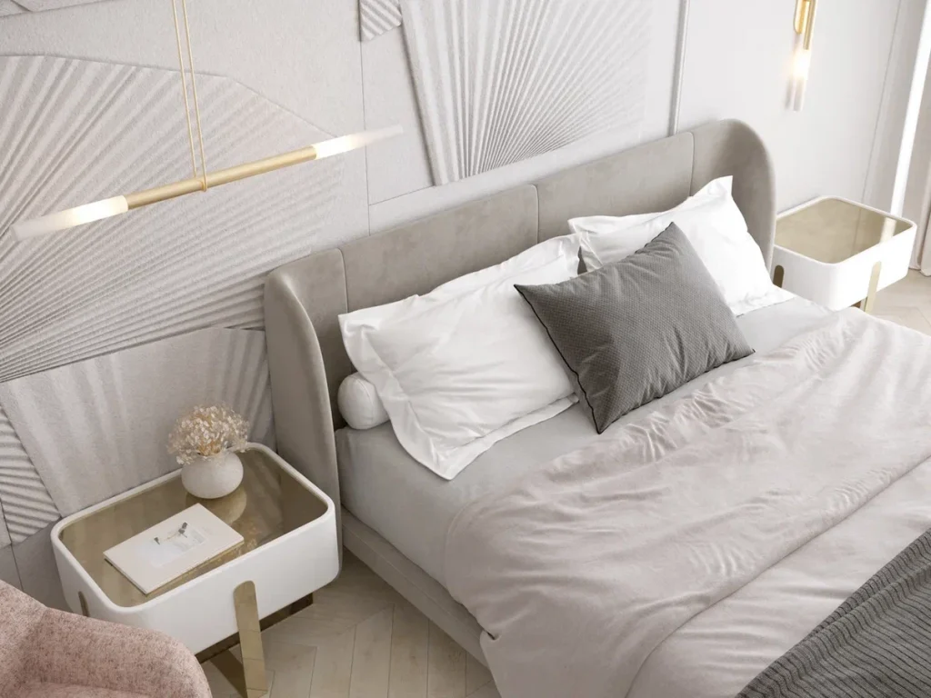 Хозяйская спальня благородная и светлая. Стены оформлены с использованием 3D панелей и молдингов. Мебель функциональная и современная.