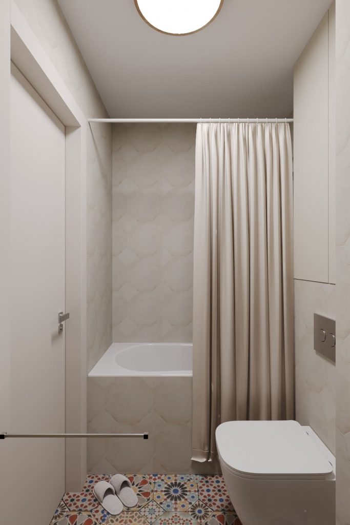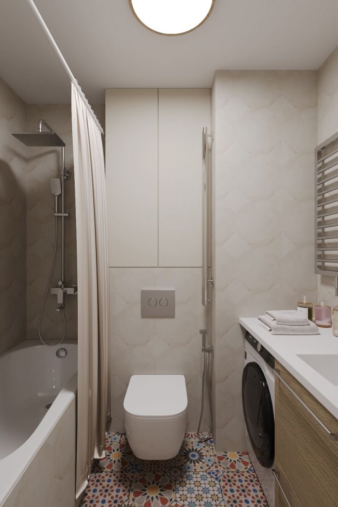 Основная отделка стен в санузле — светлая плитка с деликатной текстурой, создающая эффект мягкости и легкости. Пол украшает яркая мозаичная плитка в средиземноморском стиле, добавляя интерьеру индивидуальности и тепла.
