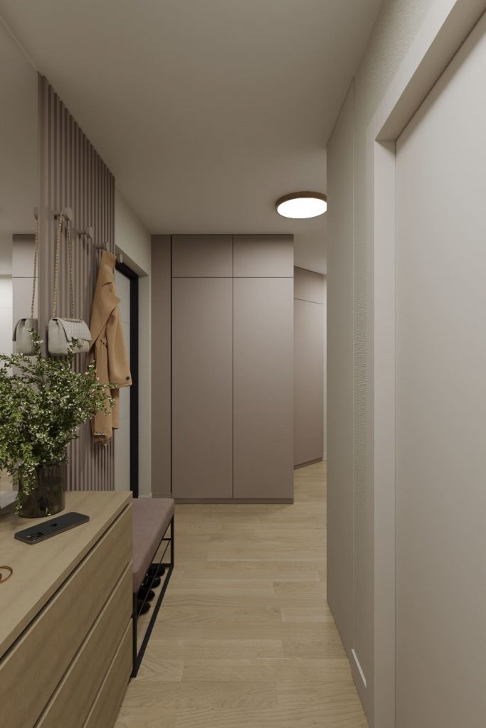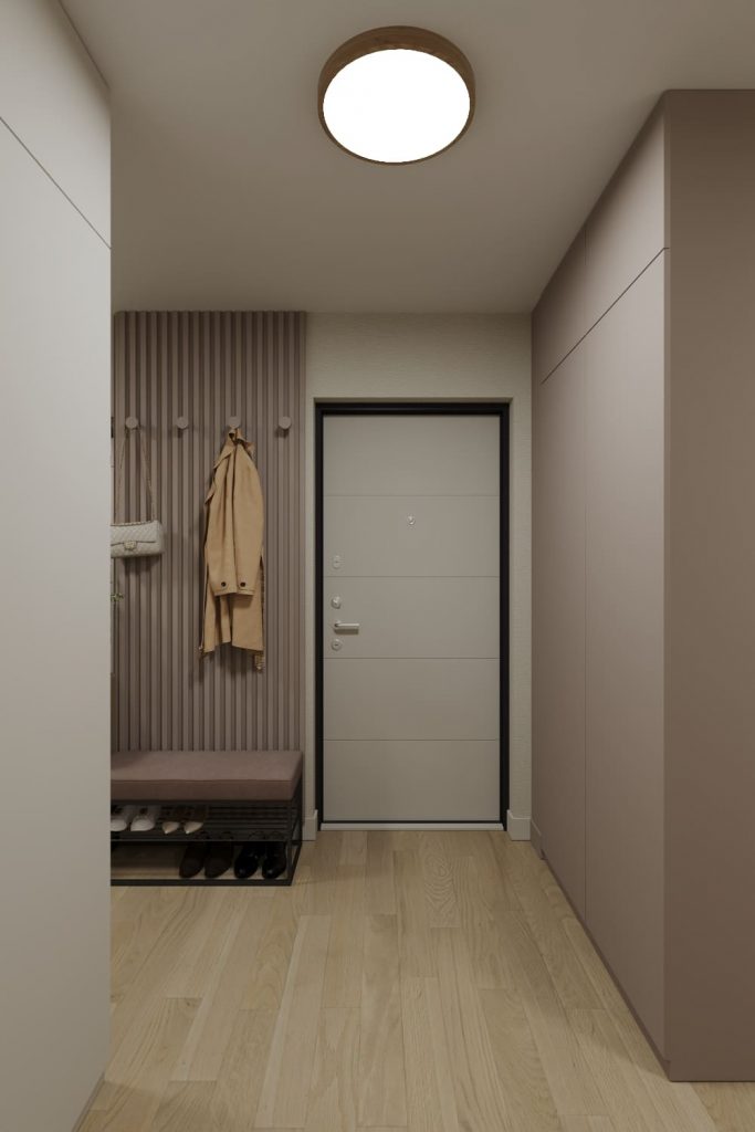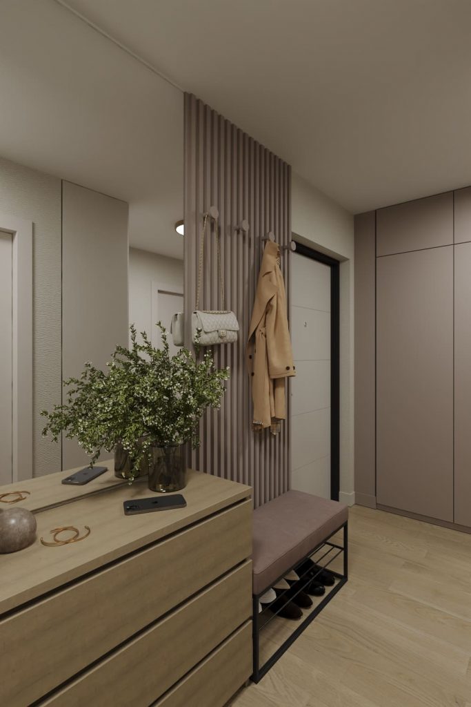 В прихожей светлые оттенки задают ощущение легкости и простора, а мягкие бежево-коричневые акценты придают интерьеру теплоты.