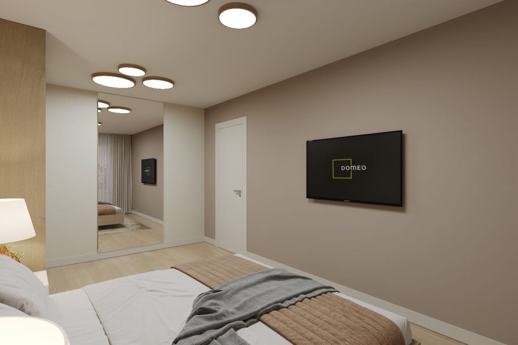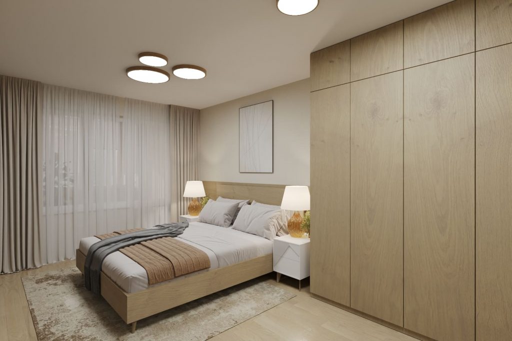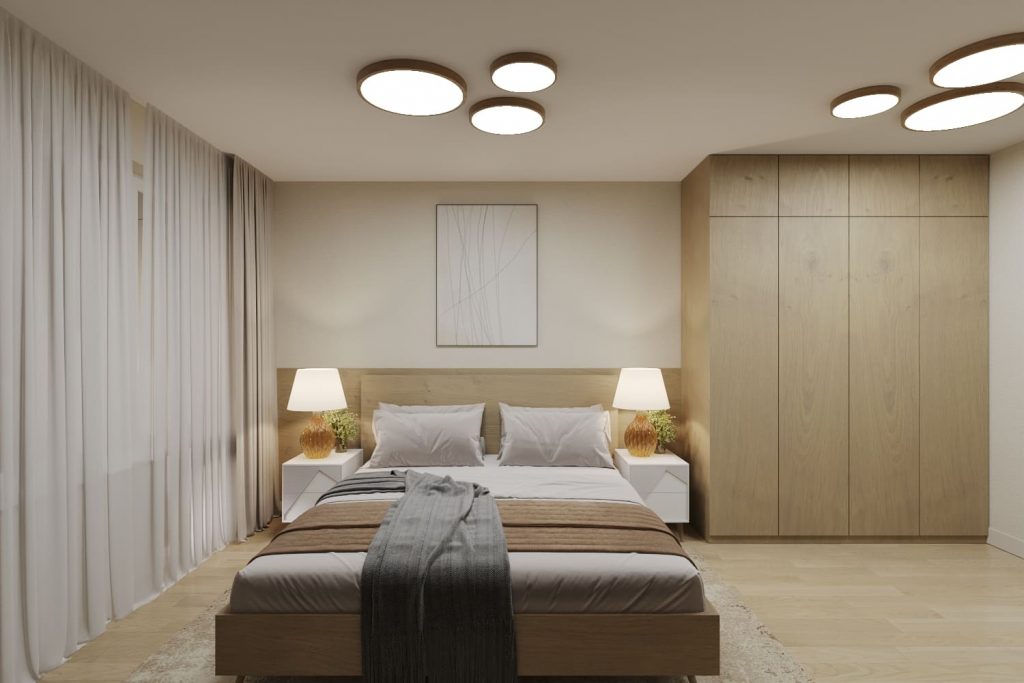 В основе дизайна спальни — теплая палитра бежевых и древесных тонов, создающая ощущение природной гармонии. Стена за кроватью оформлена деревянной панелью, поддерживающей естественную текстуру и визуально объединяющей интерьер.