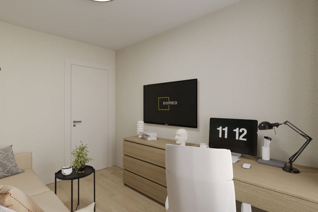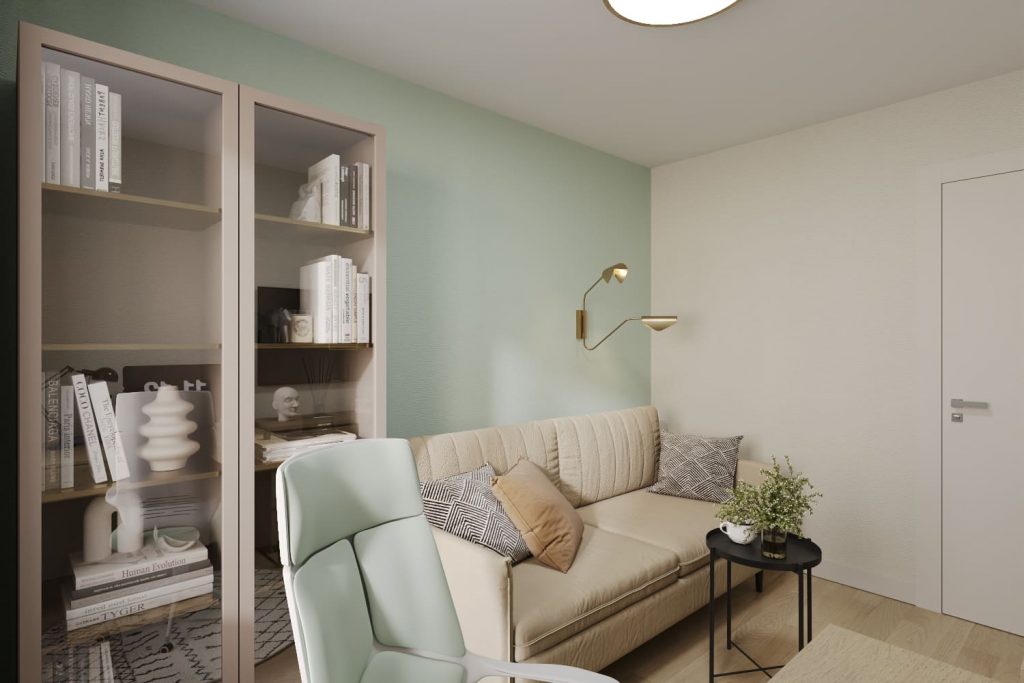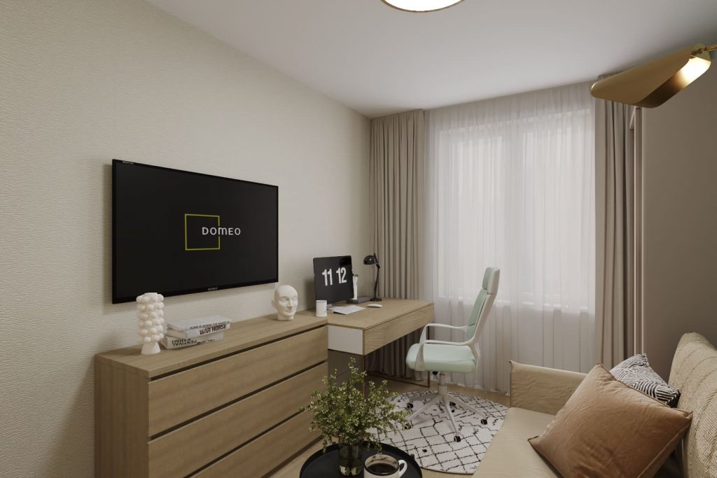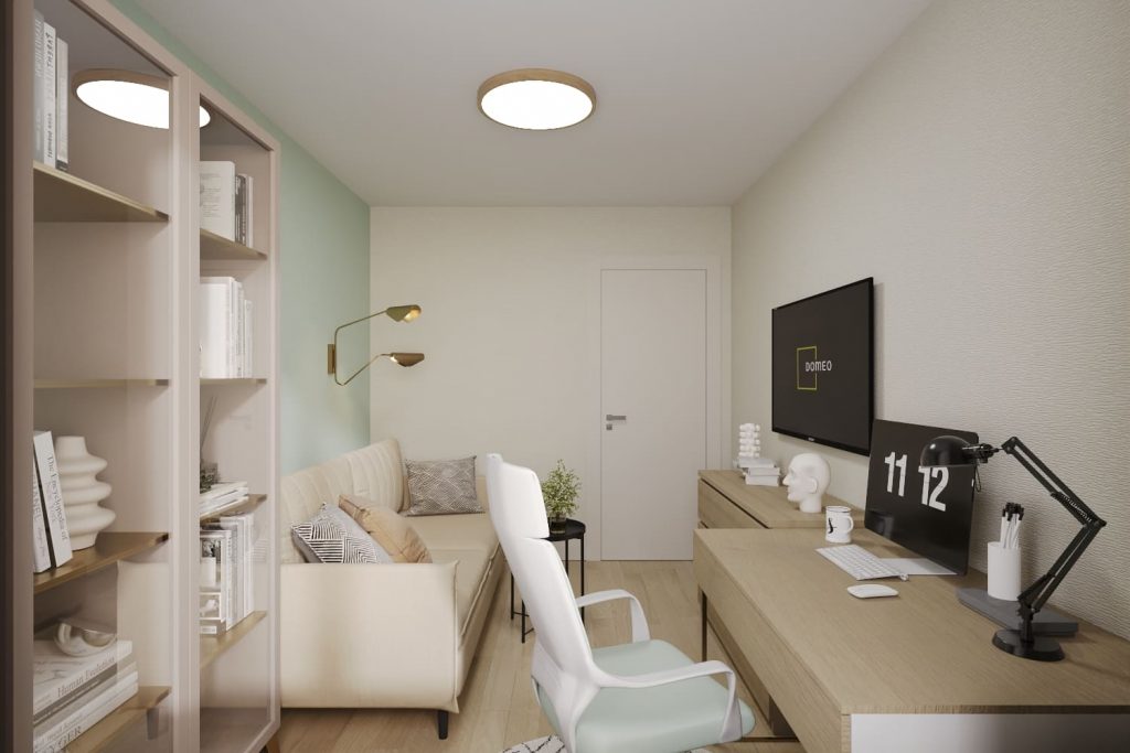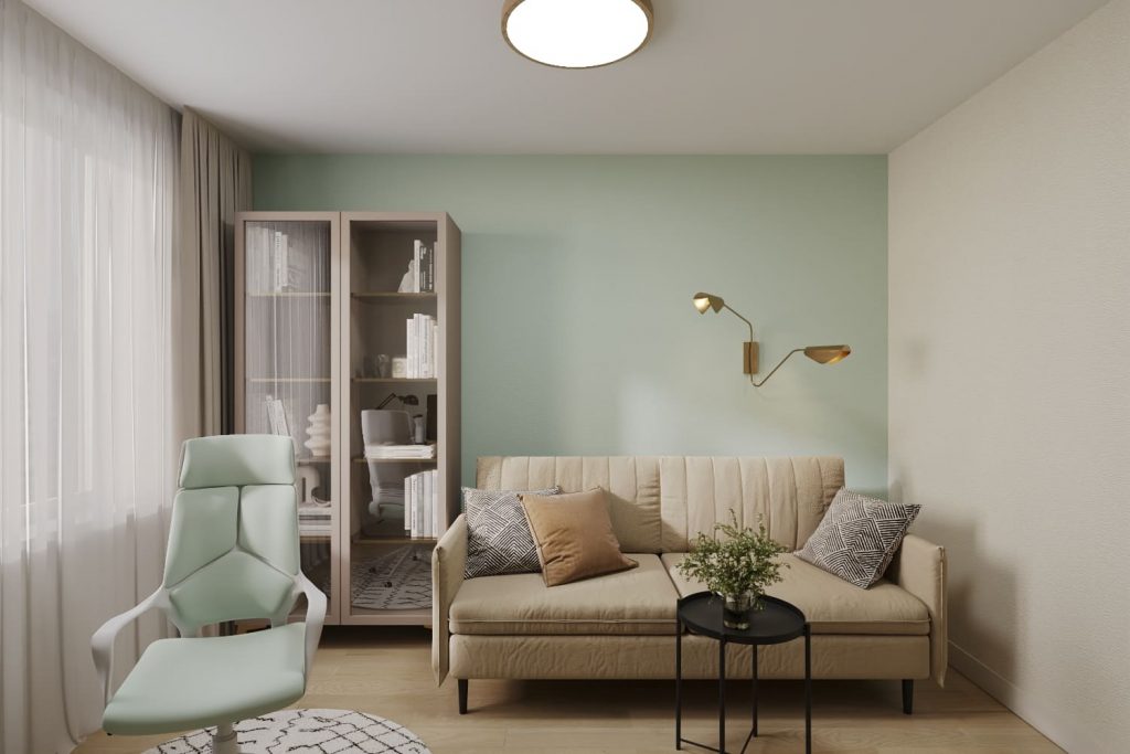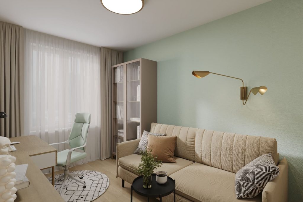 Компактный, но функциональный письменный стол расположен у окна, обеспечивая естественное освещение в течение дня. Над столом — минималистичный монитор, настольная лампа и аксессуары, которые помогают поддерживать порядок. Эргономичное кресло с мягкой мятной обивкой добавляет комфорта при длительной работе.