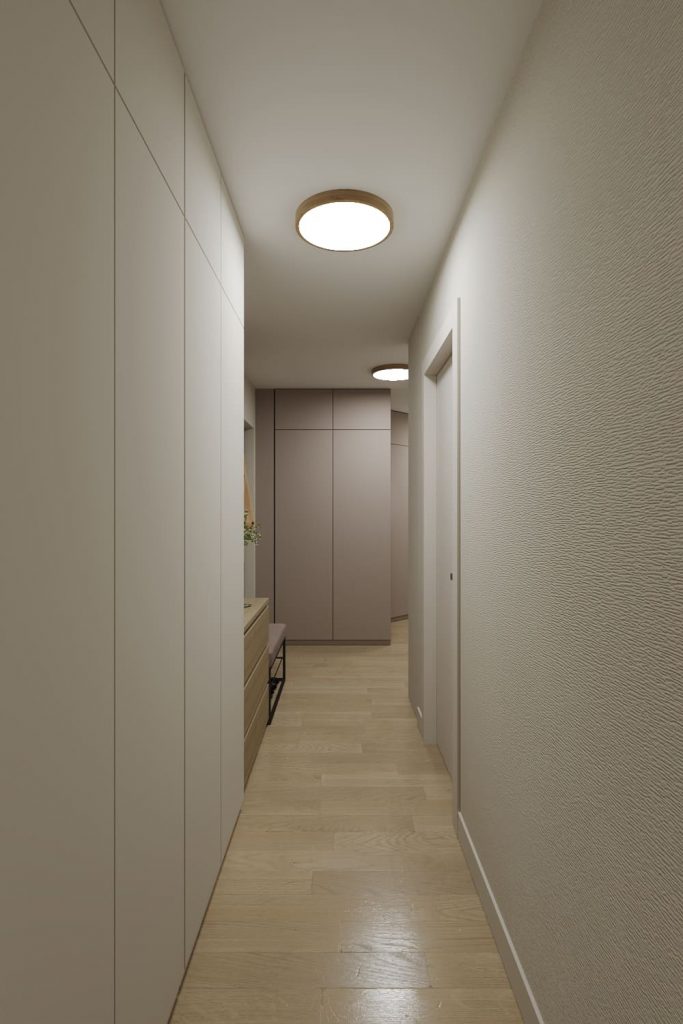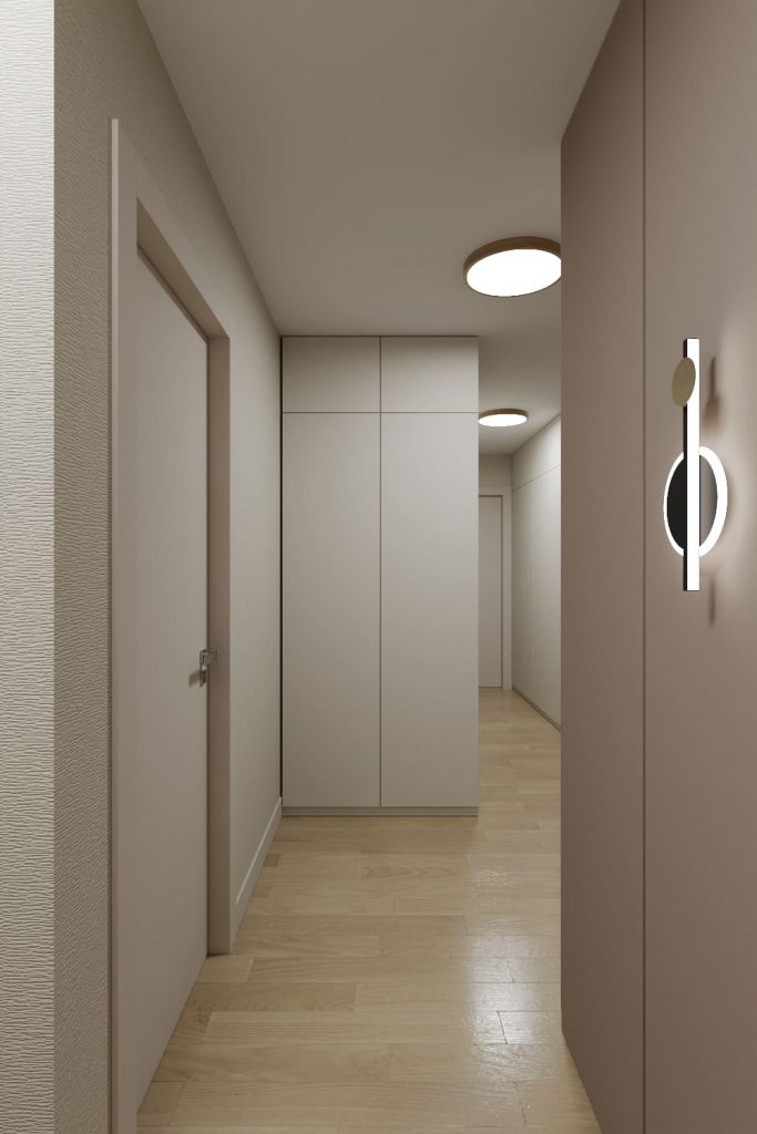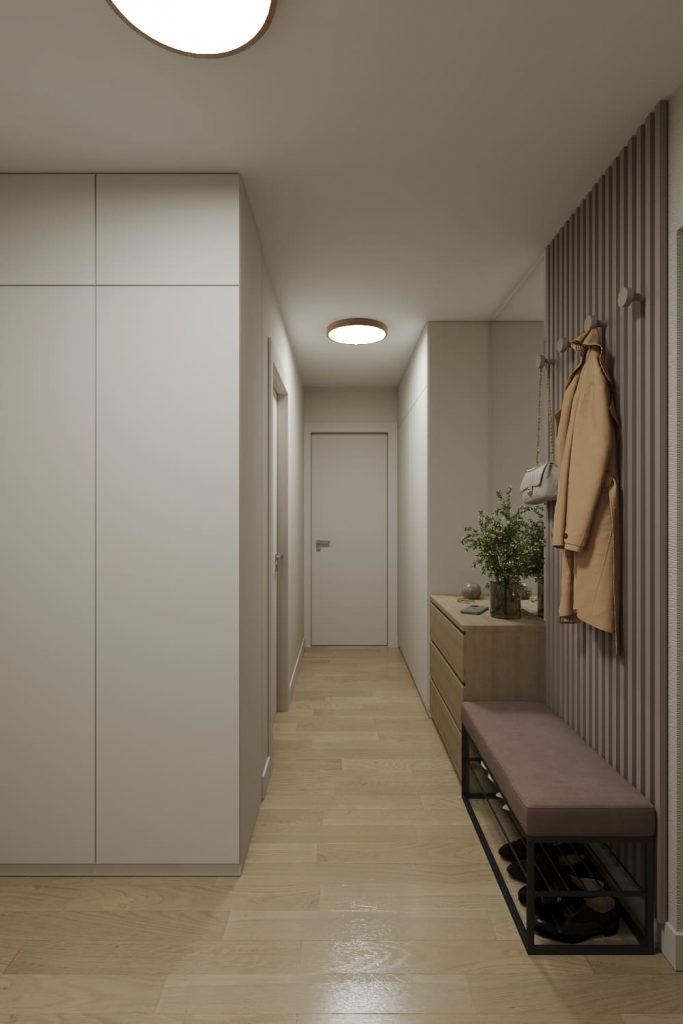 Коридор стал естественным продолжением прихожей, поддерживая общий стиль квартиры — легкий, светлый, с мягкими средиземноморскими акцентами.