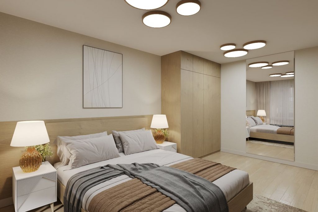 Главный элемент спальни — удобная кровать с мягким текстилем, дополненная фактурным пледом и подушками. Два белых прикроватных столика с дизайнерскими лампами делают интерьер сбалансированным, а мягкий рассеянный свет добавляет уюта.