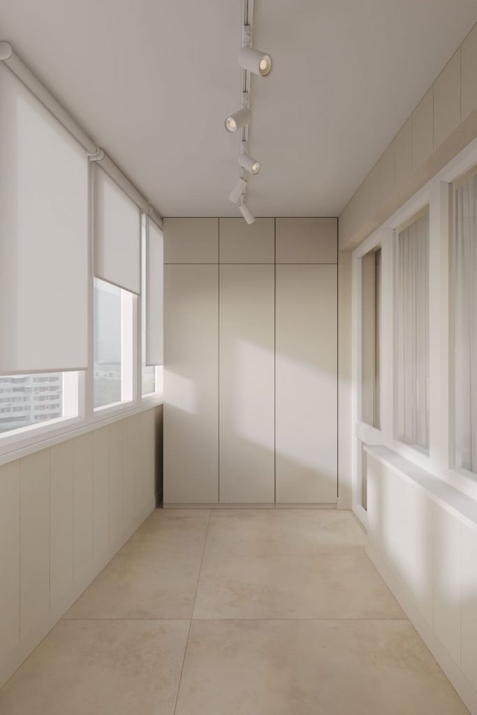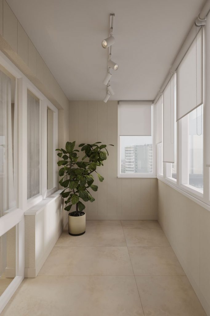 Балкон оформлен в светлых натуральных тонах, с панелями под дерево и крупноформатной плиткой на полу. Лаконичное трековое освещение делает пространство светлым и комфортным. Закрытые шкафы обеспечивают дополнительное хранение, а живая зелень добавляет уюта. Большие окна с рулонными шторами позволяют контролировать уровень естественного освещения.